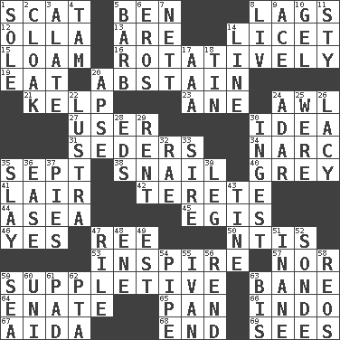 ACROSS 1. Jazz singing style 5. Benjamin's nick name 8. Falls behind 12. Rounded earthenware pot or jar 13. "We ___ not amused" (Victoria) 14. It is permitted: Lat. 15. Rich soil 16. Happening in regular succession 19. Erode 20. Refrain by choice 21. Seaweed 23. A saturated hydrocarbon 24. Leather borer 27. One who uses or employs something 30. It may be bright or harebrained 31. Spring feasts 34. Drug cop 35. Back-to-school mo. 38. Slow-paced one 40. Jennifer or Joel 41. Den 42. Cigar-shaped 44. At sea 45. Armor plate that protects the chest 46. It is so 47. To sift 50. Nuclear Threat Initiatives 53. Motivate 57. Not either 59. Supplying deficiencies 63. Object of repulsion 64. Related on the mother's side 65. Baking dish 66. _ china 67. Opera by Verdi 68. Conclusion 69. Observes DOWN 1. Flatfish 2. Anything that covers or conceals 3. Having winglike extensions 4. Scottish cap 5. Sharp remark 6. Greek god of love 7. Remaining after all deductions 8. 54 in ancient Rome 9. Adept person 10. Set 11. Filthy place 14. Actor's bit 17. Auto club (abbr.) 18. Shallow baking pan 20. Domed church section 22. A period of five years 24. The sixth month of the Jewish calendar 25. Past tense of be (plural) 26. Made of lace 28. Begley and Asner 29. Monthly bill 30. Swallow 32. Actress Charlotte 33. The founder of a family 35. Kill 36. Relaxation 37. Sliced desserts 39. Part of a journey 43. Prong on a fork 47. Cause heat under the collar 48. Compass dir. 49. Eastern Standard Time (abbr.) 51. Empty; void 52. Message 54. Corncob 55. "Terrible" tsar 56. Tear apart 58. Vintage cars 59. Ocean 60. Corn or form start 61. Groovy apt. 62. Parent Teacher Assoc. 63. Again