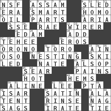 ACROSS 1. Overdraft (abbr.) 4. Indian state 9. Downhill vehicle 13. Period 14. Don Adams' spy role 15. Same (prefix) 16. Lubricate 17. Components 18. Roberta Peters solo 19. Compass dir. 21. Actress Charlotte 22. One who wires 24. Dutch treat 26. Increase 27. Giggle 29. Greek god of love 30. U. of Maine site 31. "Corrida" creature 33. The 18th letter of the Arabic alphabet 36. Bear (Spanish) 37. Nestling 40. What Jean-Claude Killy likes to do 41. Directed 42. Nathan's nickname 43. Columnist Joseph or Stewart 45. Dry up 47. Aches 48. Being at a high temperature 49. Cloth borders 50. Place in a line 52. Area sheltered from the wind 54. Parent Teacher Association (abbr.) 56. Austrian river, tributary to the Danube 57. Smooth fabric 59. Wing 61. Portable shelter 62. Remove soap 63. Tired old horse 64. Sinks 65. Feeling or showing extreme anger 66. Standoff DOWN 1. Modern: prefix 2. Indian titles of respect 3. It jiggles the polygraph 4. Viper 5. Excessive but superficial compliments 6. "Two Mules for Sister ____" 7. Johnson of "Laugh-In" 8. Mountains (abbr.) 9. Pottery fragments 10. Old wives' tales, e.g. 11. Arab leader 12. ___ good deed 20. Locale of original sin 22. Make _____ (do battle with) 23. Wedding promise 25. Age 27. Instrument 28. Celtic language 29. 4th largest of the Great Lakes 31. Russian ruler of old 32. Baseball player Mel 33. Helper 34. Visual representation of an object 35. Pinches, bites 38. Maternal 39. Stare wonderingly 44. Desk light 45. Upper-body garments 46. A really long time 49. Robbery 50. At sea 51. Long (Scottish) 52. Den 53. Inactive volcano in Sicily 55. Jai _ 56. It is 57. Indian title of respect (Mr.) 58. Born 60. Ripen