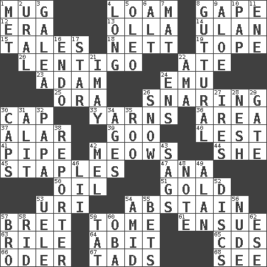ACROSS 1. Large cup 4. Rich soil 8. Yawn 12. Period 13. Rounded earthenware pot or jar 14. ____ Bator 15. Stories 18. Remaining after all deductions 19. Drink excessively 20. Small, flat, pigmented spot on the skin 22. Had dinner 23. First of billions? 24. Australian flightless bird 25. Mouth or opening 26. Catching in a trap 30. Head covering 33. Entertaining tales 36. Type of rug 37. Having or resembling wings 39. Thick or sticky substance 40. For fear that 41. Corncob 42. Catcalls? 44. A female animal or person 45. Paper fasteners 47. Santa ___, CA 50. Petroleum 51. Aureate 53. RI univ. 54. Refrain by choice 57. Cy Young winner Saberhagen 59. Heavy book 61. Follow as a consequence or result 63. Cause heat under the collar 64. "This won't hurt ____!" 65. Music discs 66. River in Europe 67. Bits 68. Perceive with the eye DOWN 1. Was introduced to 2. Mountain range 3. An organ shaped like a helmet 4. Protracted 5. Margarine 6. Keyboard modifier key 7. Floor protector 8. From the throat 9. _ vera 10. Infant food 11. Compass dir. 16. Inside; within (prefix) 17. Play the lead 21. "If ____ say so..." 22. Nursemaid (var.) 24. Followers of ems 26. Overwhelm 27. Angers 28. Delicate 29. Yard entry 30. Balmoral and tarboosh 31. Came down and settled, as after flight 32. Dad 34. Eons 35. Friend of Pooh 38. News announcer 42. Cartoonist voice _ Blanc 43. Droops 46. Cards in a Roman deck? 48. Make mention of 49. Actor Alda or Thicke 52. Plates 53. Ubangi River tributary 54. Among 55. Wagers 56. Unadorned 57. Sis' sibling 58. To free from 59. Make lace 60. Chief or king in Benin or Nigeria 62. Compass dir.