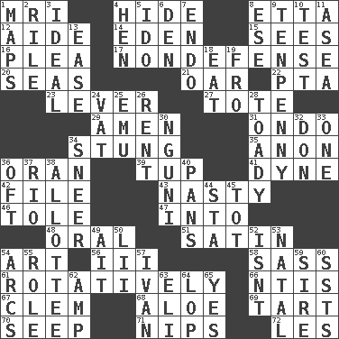 ACROSS 1. Medical imaging device (abbr.) 4. Flintstone garb 8. Singer James 12. Assistant 14. Genesis locale 15. Perceives with the eye 16. Entreaty 17. Unrelated to defense, as in spending 20. Oceans 21. Boat paddle 22. Parent Teacher Assoc. 23. Prying instrument 27. Haul 29. So be it 31. Southwest Nigerian state 34. Feeling sharp psychological pain 35. At once, immediately (arch.) 36. Northwest Algerian city 39. Uncastrated adult male sheep 41. Centimeter-gram-second unit of force 42. Do some clerical work 43. Characterized by obscenity 46. Lacquered or enameled metalware 47. To the inside or interior of 48. Spoken 51. Smooth fabric 54. Tate display 56. One more than two 58. Backtalk 61. Happening in regular succession 66. Nuclear Threat Initiatives 67. Clement's nick name 68. _ vera 69. Small pie 70. Ooze 71. Cuts off 72. French article DOWN 1. Atlas contents 2. Cause heat under the collar 3. Standard of perfection 4. Layer 5. Wedding promise 6. Lair 7. Inside; within (prefix) 8. Compass dir. 9. 3-inch nail 10. Trial 11. Toward the sea 13. Comfort 18. Ingest 19. Back 24. Large container 25. Australian flightless bird 26. Monthly bill 28. Sycophant 30. Group of southern Bantu languages 32. Spanish title 33. Single 34. Scornful expression 36. Often (poetically) 37. _ de Janeiro 38. One to whom something is allotted 40. Baking dishes 44. R.R. building 45. Small child 49. Small island 50. Cards in a Roman deck? 52. Is not 53. Brizilian seaport 54. Curves 55. Hero or heavy, e.g. 57. "Terrible" tsar 59. Male parent of an animal 60. Fast planes 62. Electrical Unit 63. Connecticut Ivy Leaguer 64. Trim (branches) 65. It is so