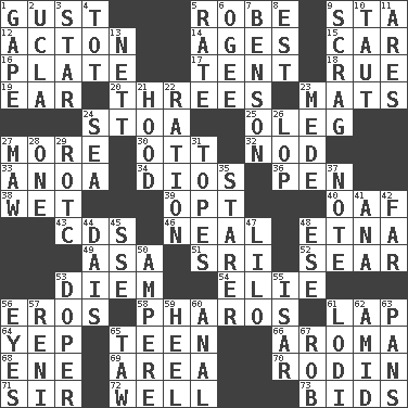 ACROSS 1. Abrupt rush of wind 5. Loose flowing garment 9. R.R. building 12. Gambison 14. Ripens 15. Auto 16. Food holder 17. Portable shelter 18. Regret 19. Hearing organ 20. Threesomes 23. Floor coverings 24. Portico 25. Cassini of fashion 27. Greater amount 30. Baseball player Mel 32. Dreamland 33. Small Philippine buffalo 34. "Vaya con ____" 36. Animal enclosure 38. Dripping 39. Choose 40. Clumsy lout 43. Music discs 46. Actress Patricia 48. Inactive volcano in Sicily 49. White ___ sheet 51. Indian title of respect (Mr.) 52. Burn superficially 53. South Vietnam president (1954) 54. Writer Wiesel 56. Greek god of love 58. N Egypt peninsula 61. Infant locale 64. Slangy assent 65. Adolescent 66. Odor 68. Compass dir. 69. Length times width 70. "The Thinker" sculptor 71. Title for a knight 72. Not ill 73. Auction offers DOWN 1. Stare wonderingly 2. Southern CA. univ. 3. Play the lead 4. Small child 5. Assign a rank or rating to 6. Double curve, resembling the letter S 7. Gillaume's butler role 8. Eastern Standard Time (abbr.) 9. Lean end of the neck 10. Strained 11. Ancient Greek god of war 13. Remaining after all deductions 21. Parka part 22. Food allowance for one day 23. Ancient Persian 24. Ocean 26. Trim (branches) 27. Opening into something insatiable 28. Single 29. College mil. group 31. Drinks excessively 35. A viewer who gazes fixedly 37. Observe 41. Santa ___, CA 42. Distant 44. Raised platform 45. Compass dir. 47. _ and Stitch 48. Compass dir. 50. Electrical Unit 53. Drug addict 55. Austrian river, tributary to the Danube 56. Snake ____ (dice throw) 57. Painter Guido (1575-1642) 59. Person who is morally reprehensible 60. Of or related to the anus 61. Farming town in central California 62. Among 63. Zero-star reviews 65. The 23rd letter of the Hebrew alphabet 67. Director Reiner