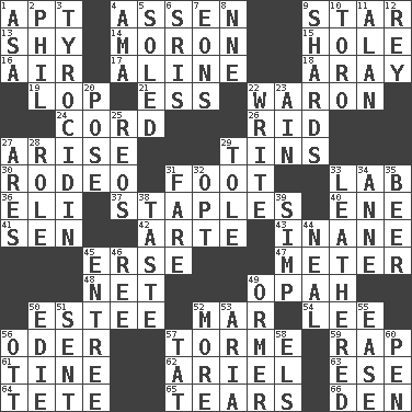 ACROSS 1. Fitting 4. NE Netherlands city 9. Play the lead 13. Like a shrinking violet 14. Person of subnormal intelligence 15. Opening into or through something 16. Atmosphere 17. Place in a line 18. Like ___ of sunshine 19. Trim (branches) 21. Double-curved letter 22. Make _____ (do battle with) 24. Drawstring 26. To free from 27. Ascend 29. Canisters 30. Cowboy competition 31. Pick up the tab 33. Experiment locale 36. Connecticut Ivy Leaguer 37. Paper fasteners 40. Compass dir. 41. Elected rep. 42. Johnson of "Laugh-In" 43. Empty; void 45. Celtic language 47. Distance measurement 48. Fish or hair follower 49. Brightly colored fish 50. First name in cosmetics 52. Third mo. 54. Area sheltered from the wind 56. Baltic tributary 57. Singer Mel 59. Reproach for some lapse or misdeed 61. Prong on a fork 62. Satellite of Uranus 63. Compass dir. 64. Wig 65. Pulls apart 66. Lair DOWN 1. White ___ sheet 2. Silvers or Donahue 3. Polypeptide antibiotic 4. Nanny (var.) 5. Having a sole or soles 6. Indian titles of respect 7. Immeasurably long periods of time 8. Compass dir. 9. Broken pieces 10. "Corrida" creature 11. Actor Alda or Thicke 12. Marina Del _, California 20. Airs 22. Compose 23. The 18th letter of the Arabic alphabet 25. Vintage cars 27. Ancient Greek god of war 28. Hero or heavy, e.g. 29. Lacquered or enameled metalware 31. Conductor's collection 32. Elect 33. Resembling or made to resemble leather 34. Singer Murray 35. Fermented drink made from hops 38. Clothes sense 39. Simple or foolish person 44. Anneal 45. Main course 46. Portuguese money of account (variant) 49. Abalone 50. Singer Brickell 51. Transmitted 52. Greater amount 53. Roberta Peters solo 55. Comfort 56. Baseball player Mel 57. Make lace 58. Raised railways 60. Fenced enclosure