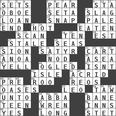 ACROSS 1. Puts into a specified state 5. Lightbulb-shaped fruit 9. R.R. building 12. Mitch Miller's instrument 13. Stalk of a moss capsule 14. Volcanic refuse 15. Grant temporary use of 16. Fastener 17. Light colored 18. Conclusion 19. Being at a high temperature 21. Consumed 22. Examine hastily 24. "___ Little Indians" 26. Eastern Standard Time (abbr.) 27. Having lost freshness 28. Oceans 29. The Jewish people; Israel 30. Letch 32. Haul 36. Small Philippine buffalo 37. Lower and raise head in agreement 38. Toward the sea 39. Shout 40. Stared 42. Is not 43. Capri or Wight 44. Sour-tasting 46. Before (prefix) 49. Friend of Pooh 50. Vintage cars 51. Fertile tracts in a desert 53. Lion 54. The 23rd letter of the Hebrew alphabet 57. To (old English) 58. Swedish rock group 61. Object of repulsion 62. Adolescent 63. Songbird 64. Taverns 65. Affirmative reply 66. Protracted 67. Proofreading order DOWN 1. Not divided or shared with others 2. Inky black, to poets 3. Inedible or poisonous agaric 4. Elected rep. 5. Inconspicuous attention getter 6. Car or cant ending 7. "One Day ___ Time" 8. Reproach for some lapse or misdeed 9. Chalkboard 10. Falsehoods 11. Representative 14. Health resort 19. Actor Linden 20. Singles 21. Followers of ems 23. Lessep's creation 24. Miss Universe 1986, Barbara Palacios _ 25. Hearing organ 27. Trig term 28. Fur scarf 29. Declare 31. White American of non-Hispanic descent 32. Capital of Egypt 33. Helper 34. Tear apart 35. Make lace 40. Bear (Spanish) 41. Have the gumption 43. Big collection agency 45. Corporate head (abbr.) 46. Marked by pouting 47. Indian princess (variant) 48. _____ Park, CO 52. Period of immesurable duration 53. Austrian-born American filmmaker Fritz 55. Queen of England 1702-14 56. Compass direction 58. Leather borer 59. Sis' sibling 60. Benjamin's nick name 61. Twice