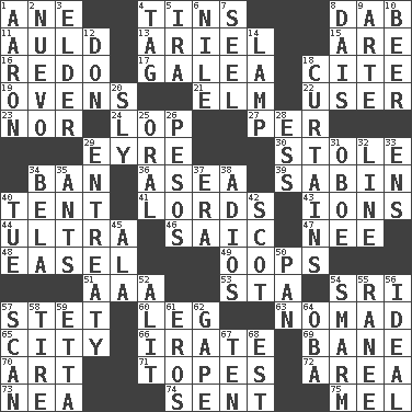 ACROSS 1. A saturated hydrocarbon 4. Canisters 8. Apply (a substance) by light strokes 11. Old (Scot.) 13. Satellite of Uranus 15. "We ___ not amused" (Victoria) 16. Make new 17. An organ shaped like a helmet 18. Quote 19. Baking chambers 21. Shade tree 22. One who makes use of a thing 23. And not 24. Trim (branches) 27. For each 29. Jane of fiction 30. Fur scarf 34. Forbid 36. Toward the sea 39. Unit of acoustic absorption 40. Portable shelter 41. Titled peers of a realm 43. Charged atoms 44. Extreme 46. Ketch in the Levant 47. Born 48. Artist's stand 49. I made a mistake 51. Auto club (abbr.) 53. R.R. building 54. Indian title of respect (Mr.) 57. Proofreading order 60. Part of a journey 63. Roamer 65. Municipality 66. Feeling or showing extreme anger 69. Object of repulsion 70. Nonscientific branch of learning 71. Drinks excessively 72. Type of rug 73. Teachers' org. 74. Posted 75. Cartoonist voice _ Blanc DOWN 1. Composer Copland 2. New (sp.) 3. A person who is older than you are 4. Label 5. Lyricist Gershwin 6. "Death on the ____" 7. Sew up the eyelids of hawks and falcons 8. Raised platform 9. Johnson of "Laugh-In" 10. Fermented drink made from hops 12. Spanish title 14. Desk light 18. Window treatments 20. Mischievous 25. Taken by mouth 26. Mexican monetary units 28. Double-curved letter 29. Plea 31. Mitch Miller's instrument 32. Actor's bit 33. Followers of ems 34. Actor Lugosi 35. Pismires 37. Epoch 38. Goodbye (Sp.) 40. Third day of the wk. 42. Native of Scotland 45. Chicken ___ king 50. Baking dish 52. Set down 54. Excessive but superficial compliments 55. Indian princess (variant) 56. Perfect 57. Examine minutely or intensely 58. Become fatigued 59. Singer James 61. Greek god of love 62. Yawn 64. Chief or king in Benin or Nigeria 67. Nine, plus one 68. Eastern Standard Time (abbr.)