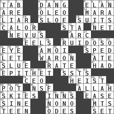 ACROSS 1. Keyboard key 4. Mild oath, euphamism for damn 8. Style 12. "We ___ not amused" (Victoria) 13. Butter sub 14. Hindu Mythology: god of death 15. One who doesn't tell the truth 17. _ gin 18. Sets of matching outer garments 19. Bodily heat indicating an inflammation 21. R.R. building 23. Fish or hair follower 24. Congenital growth or mark on the skin 26. Curve 28. Snakelike fish 30. Boisterous (Brazilian Portuguese) 34. Sight organ 37. Mine, in Marseilles 39. Broke a traffic law 40. Allow 41. Make _____ (do battle with) 43. Had dinner 44. Turn sharply 46. Assign a rank or rating to 47. Possessed 48. Curse 51. Fast planes 54. Corporate head (abbr.) 55. Robbery 58. Plant holder 61. Overdraft (abbr.) 63. Assad's deity 65. Atmospheres 67. Taverns 71. Relaxation 72. Trig term 73. Words to Nanette 74. Mountains (abbr.) 75. Adolescent 76. Lyric poems 77. Put into a specified state DOWN 1. Baby powder 2. Believer in; advocate of (suffix) 3. Memphis, Tenn. Street 4. Two (Sp.) 5. 100% 6. Modern: prefix 7. Travels 8. Australian flightless bird 9. (Had) reclined 10. Johnson of "Laugh-In" 11. Political cartoonist Thomas 16. Be footloose 18. Indian skirt 20. Sorrow 22. The 19th letter of the Greek alphabet 25. Cole _ (cabbage dish) 27. Music discs 29. Don Adams' spy role 30. Disturbances 31. Brightly colored fish 32. Stalk of a moss capsule 33. Wrote a lyric poem 34. Otherwise 35. Sharp bark 36. Needle case 38. Mouth or opening 42. Tender 45. And so on (abbr.) 49. Coop moms 50. Greek goddess of the dawn 52. Beverage made from leaves 53. Filth; sediment 56. Criticizes harshly 57. Clothes sense 58. Inconspicuous attention getter 59. Migrant worker of the '30s 60. Prong on a fork 62. A pale, very dry sherry 64. Behest 66. Car or cant ending 68. Allow head to fall sleepily 69. Compass dir. 70. Mayday
