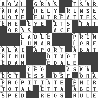 ACROSS 1. Soup holder 5. Pate de foie ____ 9. Russian ruler of old 13. Like ___ of sunshine 14. Depend 15. Wash lightly 16. Observe 17. Pleas 19. Compass dir. 20. Sight organ 21. ___ a Wonderful Life 22. Make lace 23. Mouths or openings 25. Adept person 26. Dipping utensil 30. Demure 34. Type of eclipse 35. Old wives' tales, e.g. 36. Mountain range southwest of Kyrgyzstan 39. To the left, to Queeg 42. Blind as ____ 43. Tall New Zealand timber tree 44. A piece of turf (Scot.) 46. Dutch treat 47. Peak District village in England 48. Corporate head (abbr.) 51. "____ silly question..." 54. Sep. follower 57. Double-curved letter 58. Order of Saint Francis (abbr.) 60. Mouth or opening 62. Conciliate 65. Independent ruler or chieftain 66. "_____ Recall" 67. Singer James 68. Collude with 69. Moved rapidly 70. Vintage cars 71. Governing power DOWN 1. Object of repulsion 2. U. of Maine site 3. Wetness 4. Potassium hydroxide 5. Jennifer or Joel 6. French philosopher Descartes 7. The first octave above the treble staff 8. Damascus' land 9. Teat (slang) 10. In a ____ (agitated or irritated) 11. At sea 12. Repose 15. Raze (variant) 18. And so on (abbr.) 20. He sold his birthright 24. Plant genus of onion and garlic 27. Heredity factor (abbr.) 28. Infant locale 29. Wear away 30. Food holders 31. Director Reiner 32. Lyricist Gershwin 33. Was introduced to 36. "We ___ not amused" (Victoria) 37. Flaplike covering 38. Housemaid (var.) 40. To free from 41. Federal power corp. 45. Norwegian king 48. To provide with a ceiling 49. Eastern Standard Time (abbr.) 50. Flexible twig of a willow tree 52. Dried seaweed eaten as food 53. Satellite of Uranus 54. Elects 55. Riding implement 56. Carryall 58. Von Bismarck 59. Oceans 61. Johnson of "Laugh-In" 63. Groovy apt. 64. Had dinner 65. Hearing organ