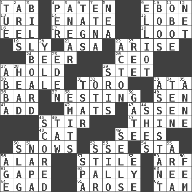 ACROSS 1. Bar bill 4. Eucharist need 9. Inky black, to poets 13. RI univ. 14. Maternal 15. Ear part 16. Snakelike fish 17. Canadian anthropologist Darnell 18. Spoils 19. Roguish 21. White ___ sheet 22. Originate 24. Fermented drink made from hops 26. Corporate head (abbr.) 27. Hold, grip (Informal) 29. Proofreading order 30. Memphis, Tenn. Street 31. "Corrida" creature 33. "One Day ___ Time" 36. Drinking establishment 37. Inhabiting a nest 40. Elected rep. 41. Find the sum of 42. Floor protectors 43. NE Netherlands city 45. Move through with a circular motion 47. One or ones belonging to thee 48. Feline 49. Observes 50. Overwhelms 52. Compass dir. 54. R.R. building 56. Having or resembling wings 57. Vertical member of a panel or frame 59. Sandy's bark 61. Stare wonderingly 62. Chummy 63. Born 64. Mild oath 65. Came up 66. Scottish cap DOWN 1. Third day of the wk. 2. Ancient Greek god of war 3. Big road sign 4. For each 5. Approach 6. Labels 7. Inactive volcano in Sicily 8. Teachers' org. 9. American author Paul (1891-1958) 10. Expressions of contempt or scorn 11. Mitch Miller's instrument 12. Fish or hair follower 20. Shout 22. Gambison 23. To separate or throw off 25. Genesis locale 27. Swedish rock group 28. Froth on beer 29. Indian titles of respect 31. Russian ruler of old 32. Baseball player Mel 33. Helper 34. Adolescent 35. Singer Murray 38. Sends forth 39. Yard entry 44. "______ My Girl" (Turtles hit) 45. Tallied 46. The 23rd letter of the Hebrew alphabet 49. Makes a sale 50. Volcanic refuse 51. California wine valley 52. Play the lead 53. Grain storage tower 55. Length times width 56. Grow older 57. Health resort 58. Sight organ 60. Opposite of masc.