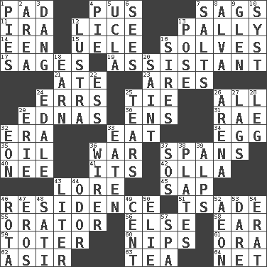 ACROSS 1. Writing tablet 4. Ichor 7. Settles 11. Retirement account (abbr.) 12. Louse (plural) 13. Chummy 14. Car or cant ending 15. Ubangi River tributary 16. Finds the solution 17. Gurus 19. Aide 21. Had dinner 23. Ancient Greek god of war 24. Blunders 25. Make a knot 26. 100% 29. Ferber et al. 30. Followers of ems 31. Actress Charlotte 32. Period 33. Ingest 34. Oval reproductive body of a fowl 35. Petroleum 36. Armed conflict 37. Connects, as a bridge 40. Born 41. It is 42. Spanish pot 43. Old wives' tales, e.g. 45. Plant excrement 46. Dwelling 51. Sadhe (variant) 55. Speaker 56. Otherwise 58. Hearing organ 59. Carrier 60. Cuts off 61. Mouth or opening 62. SW Saudi Arabia district 63. Afternoon social gathering 64. Fish or hair follower DOWN 1. Sliced desserts 2. Length times width 3. Mild oath, euphamism for damn 4. Sliced dessert 5. Southern CA. univ. 6. Observes 7. Table seasonings 8. Inventor's middle name 9. Small, secluded valley 10. System (abbr.) 12. A period of five years 13. Airs 16. Founders of families 18. Merit 20. Virtuous person 22. Curvy letter 24. Peak District village in England 25. Separates forcefully 26. Sports stadium 27. Falls behind 28. Part of a journey 29. One of the Great Lakes 32. Period of immesurable duration 33. Eroded 36. One who wires 37. Distress signal 38. Food holders 39. High mountains 43. 61 cubic inches 44. Scent 46. Round or rotation of duties 47. Greek god of love 48. Suttee (variant) 49. Penny 50. Writer Wiesel 52. Age 53. Have the gumption 54. Part of Q.E.F. 57. Health resort