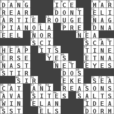 ACROSS 1. Mild oath, euphamism for damn 5. Frozen water 8. Spoil 11. Buttocks 12. Do not 14. Connecticut Ivy Leaguer 15. Nick name for Arthur 17. Makeup applied to the cheeks 18. Tired old horse 19. Player piano 21. Before (prefix) 22. Heredity factor (abbr.) 23. Snakelike fish 24. Or not 25. Teachers' org. 27. _-fi 28. Go away! 31. Pile 35. ___ a Wonderful Life 37. Prong on a fork 38. Celtic language 39. Consenting reply 41. Inactive volcano in Sicily 42. Political cartoonist Thomas 43. Fish or hair follower 45. Snake ____ (dice throw) 46. Commotion 47. Two (Sp.) 49. Title for a knight 51. Make supply last 52. Ocean 55. Feline 57. Black tropical American cuckoo 60. Thinks logically 62. Actress Gardner 63. Settings 65. Table seasonings 66. Acquire through effort 67. Liveliness 68. It may be bright or harebrained 69. Fast jet (abbr.) 70. Raised railways 71. Dormintory (informal) DOWN 1. Window treatment 2. Nest on high 3. Relating to or accompanying birth 4. Broad smile 5. Wedding promise 6. Clever action or accomplishment 7. Engineer (abbr.) 8. Ananias' fault 9. Actor Alda or Thicke 10. Port city in Latvia 13. Adolescent 16. Immeasurably long periods of time 17. Noteworthy scarcity 20. Venues 26. First name in cosmetics 29. Singer Murray 30. Beverages made from leaves 31. Coop moms 32. Part of Q.E.F. 33. Helper 34. _ dish (used to culture cells) 36. Elected rep. 40. Spring feasts 44. Casino tip 48. Oceans 50. Raze (variant) 52. Twentieth part of a lira 53. Keyboard key 54. Indian state 55. Crow sounds 56. Opinion 58. Mediterranean tributary 59. Slanted text style (abbr.) 61. Expressed in words 64. Followers of ems