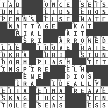 ACROSS 1. Bit 4. At one time in the past 8. Puts into a specified state 12. Corn or form start 13. Hats (slang) 14. Greek god of love 15. Actor Sean's family 18. Otherwise 19. Nathan's nickname 20. Electrical Measurement 22. Krazy ___ of comics 23. Monetary unit of Yemen 24. Small island 25. Indian title of respect (Mr.) 26. Moved like an arrow 30. Falsehood 33. Collection of objects 36. Assign a rank or rating to 37. Gumbo ingredient 39. RI univ. 40. Astound 41. Dormintory (informal) 42. Suffix with ecto or cyto 44. Teat (slang) 45. Motivate 47. Shade tree 50. Compass dir. 51. "Vaya con ____" 53. Lyricist Gershwin 54. Under perfect conditions 57. Singer James 59. Inactive volcano in Sicily 61. Rob, plunder, or pillage 63. Heroin 64. "I Love _" 65. Nine, plus one 66. Lacquered or enameled metalware 67. Oceans 68. Curvy letter DOWN 1. Uncastrated adult male sheep 2. Afresh 3. Middle Eastern gold or silver currency 4. Cassini of fashion 5. Mediterranean tributary 6. Music discs 7. Compass dir. 8. Legislators 9. Part of Q.E.F. 10. Small child 11. Compass dir. 16. Nuclear Threat Initiatives 17. Play the lead 21. Set down 22. Apertif with cassis 24. "We ___ not amused" (Victoria) 26. Advice 27. Electrical Unit 28. Needle holder 29. Gouge 30. Farming town in central California 31. Picture 32. Blunders 34. General guideline 35. Mouth or opening 38. Electrical Measurement 42. Before (prefix) 43. Ancient Persian 46. _ tizzy (2 wds.) 48. One who doesn't tell the truth 49. Undercover agent 52. Schedule 53. Slanted text style (abbr.) 54. South American Indian 55. 24-hour periods 56. Jacques Cousteau's middle name 57. Eastern Standard Time (abbr.) 58. Ring climax 59. Raised railways 60. Third day of the wk. 62. Followers of ems