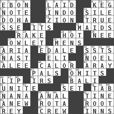 ACROSS 1. Inky black, to poets 5. Put down 9. Barrel 12. Musical sound 13. Southeast Asian peninsula 14. Drop; flow; fall 15. Capital of the state of Qatar 16. The Jewish people; Israel 17. Loyal 18. Compass dir. 19. ___ a Wonderful Life 21. Unmarried girls 22. Libertine 24. Being at a high temperature 26. Born 27. A small or young owl 28. Not women's 29. Roberta Peters solo 30. Peak District village in England 32. Fast planes 36. Political cartoonist Thomas 37. Connecticut Ivy Leaguer 38. Christmas carol 39. Toward shelter 40. Bodily heat indicating an inflammation 42. Like ___ of sunshine 43. Friends 44. Leaves out 46. Mouth edge 49. Big collection agency 50. Indonesian resort city 51. Join together 53. Arrange properly for use 54. Keyboard key 57. Nanny 58. Of or related to the anus 61. Prong on a fork 62. Afresh 63. Round or rotation of duties 64. Carrot, for example 65. Marina Del _, California 66. Ship's personnel 67. Taverns DOWN 1. Conclusions 2. Scornful sounds 3. Else 4. Teachers' org. 5. Belonging to Elizabeth 6. Cuckoo 7. Wedding promise 8. Spanish title 9. Japanese brewing company 10. Dodge 11. Honkers 14. R.R. building 19. Mamie's mate 20. False hair 21. Mountains (abbr.) 23. Having winglike extensions 24. Sun: prefix 25. Single 27. Spoken 28. Promenades 29. Santa ___, CA 31. Allots cards 32. Slow-paced one 33. Determination 34. Beverages made from leaves 35. Secret 40. 4-wheeled motor vehicle 41. Loose flowing garment 43. Sliced dessert 45. Floor covering 46. Type of eclipse 47. Lacking in sense or substance 48. Abounding in pines 52. The 23rd letter of the Hebrew alphabet 53. Cole _ (cabbage dish) 55. At once, immediately (arch.) 56. Antes 58. Curve 59. Or not 60. Had dinner 61. Three (prefix)