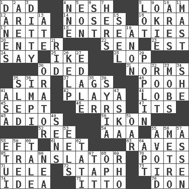 ACROSS 1. Male parent 4. Delicate 8. Rich soil 12. Operatic vocal solo 14. Olfactory organs 16. Gumbo ingredient 17. Remaining after all deductions 18. Pleas 20. Keyboard key 22. Elected rep. 23. Eastern Standard Time (abbr.) 24. Declare 25. Mamie's mate 28. Trim (branches) 30. Wrote a lyric poem 31. Typical models 35. Title for a knight 37. Fails to keep up a pace 40. "Silly old bear" 41. _ mater 42. Beach, in Buenos Aires 44. Ear part 45. Back-to-school mo. 46. Blunders 47. It is 48. Goodbye (Sp.) 50. Picture 52. To sift 54. American Automobile Association (abbr.) 55. Nanny (var.) 58. Lizard (obsolete) 61. Fish or hair follower 63. All-night dance parties 65. Interpreter 70. Cooking vessels 71. Ubangi River tributary 72. Staphylococcus 73. Become fatigued 74. The content of cognition 75. "Tell ____ the Marines!" 76. Spanish title DOWN 1. Natives or inhabitants of Denmark 2. Sports stadium 3. Simple song 4. Compass dir. 5. Period of immesurable duration 6. Fast jet (abbr.) 7. Possessive pronoun 8. Car dealer's back yard 9. Migrant worker of the '30s 10. Ancient Greek god of war 11. Vertical spar for supporting sails 13. Had dinner 15. Sew up the eyelids of hawks and falcons 19. Soon (poet.) 21. To free from 26. Seaweed 27. Peak District village in England 29. Cotton for raincoats, e.g. 30. Speaker 32. Carrot, for example 33. Disorderly crowds 34. A female animal or person 35. Downhill vehicle 36. Body of Kaffir warriors 38. Slender fish 39. Damascus' land 41. White ___ sheet 43. "____ silly question..." 49. Elected reps. 51. Boat paddle 53. Snakelike fish 55. Keep away from 56. Paris' subway 57. NE Netherlands city 58. Needle holder 59. Flintstone 60. Story 62. Jacques of French films 64. Fitting 66. Teachers' org. 67. Make lace 68. Elect 69. 17th letter of the Greek alphabet
