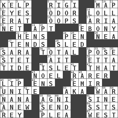 ACROSS 1. Seaweed 5. Swiss mountan, "Queen of the Mountains" 9. Atlas unit 12. Sight organs 13. Aroma 14. Hang loosely or laxly 15. Part of Q.E.F. 16. I made a mistake 17. Operatic vocal solo 18. Fish or hair follower 19. Fitting 21. Dark wood 22. Coop moms 24. Animal enclosure 26. Teachers' org. 27. Is inclined (to) 28. Downhill vehicle 29. "Two Mules for Sister ____" 30. "_____ Recall" 32. Airs 36. Proofreading order 37. Small island 38. Singer James 39. Periodic rise and fall of the sea level 40. Small island 42. Not this but _ 43. Christmas carol 44. More valued for its uncommonness 46. Mouth edge 49. Followers of ems 50. Independent ruler or chieftain 51. Join together 53. Alias (abbr.) 54. Armed conflict 57. Nanny 58. Hindu god of fire 61. Trig term 62. Afresh 63. Transmit 64. Fast planes 65. Marina Del _, California 66. Entreaty 67. 270 degrees DOWN 1. Peachy ____! 2. Jane of fiction 3. Tough but pliablecoriaceous 4. Pacific Standard Time (abbr.) 5. Carrot, for example 6. Wedding promise 7. Grand Old Party 8. Big collection agency 9. Person of subnormal intelligence 10. Place in a line 11. Beach, in Buenos Aires 14. Experiment locale 19. Also 20. Inconspicuous attention getter 21. Conclude 23. Maternal 24. Food holder 25. Snakelike fish 27. Jacques of French films 28. Free of sound 29. Fast jet (abbr.) 31. Fertile tracts in a desert 32. _ dish (used to culture cells) 33. Else 34. Play the lead 35. Consume 40. Electrically charged atom 41. Long journey 43. Born 45. Nanny (var.) 46. Type of eclipse 47. Silly 48. Abounding in pines 52. The 23rd letter of the Hebrew alphabet 53. Opera by Verdi 55. Pismires 56. Relief 58. Cleo's killer 59. Set 60. Compass dir. 61. Compass dir.