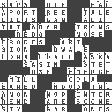 ACROSS 1. Plant excrements 5. Shoshoni 8. Actor Linden 11. To the left, to Queeg 13. To separate or throw off 14. Falsehood 15. Ms. Damita and namesakes 16. Separate the seeds from cotton 17. Came down and settled, as after flight 18. Make lace 19. The sixth month of the Jewish calendar 21. Removes the wrinkles 22. Redecorate 24. Sense of smell 25. Eats (away) 27. Tate display 29. The Jewish people; Israel 30. A sleeping potion; an opiate (poet.) 32. Pulitzer Prize-winning author Ferber 33. Peak District village in England 35. "____ silly question..." 39. Indian antelope 41. Proofreading order 42. Purpose 43. Develop 45. Place where flour is made 48. Root beer relative 49. Having ears or earlike features 50. Parka part 52. Three (prefix) 55. Soon (poet.) 56. Lower and raise head in agreement 57. Keyboard key 59. Tear apart 60. "We ___ not amused" (Victoria) 61. Biscuitlike quick bread 62. Filthy place 63. Slender fish 64. Washington bills DOWN 1. Table seasoning 2. Capital of Western Samoa 3. Characterized by complete cowardliness 4. _ Lanka 5. Capital and largest city of Mongolia 6. Rend 7. Car or cant ending 8. Radiant circles of light 9. Place in a line 10. Allows 12. Sadhe (variant) 14. Edible starchy tuberous root 20. Two (Sp.) 21. International (abbr.) 23. Ferber et al. 25. Compass dir. 26. To free from 27. Leather borer 28. Actress Charlotte 30. One of the 12 tribes of Israel 31. Artist's stand 33. Double-curved letter 34. Expire 36. Ski resort town in Vermont 37. Barrel 38. Had dinner 40. Old (Scot.) 43. Environmental prefix 44. Methods 45. French painter Edouard 46. Literary sarcasm 47. Grant temporary use of 49. Hearing organs 50. Israeli folk dance 51. Baltic tributary 53. French philosopher Descartes 54. Angers 56. Tired old horse 58. Non-commissioned officer (abbr.)