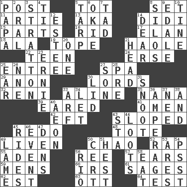 ACROSS 1. Mail 5. Small child 8. Put into a specified state 11. Nick name for Arthur 13. Alias (abbr.) 14. "You Light Up My Life" star Conn 15. Components 16. To free from 17. Flair 18. According to 19. Drink excessively 21. White Person, in Hawaii 22. Adolescent 24. Celtic language 25. Main course 27. Health resort 29. At once, immediately (arch.) 30. Domineers 32. Painter Guido (1575-1642) 33. Place in a line 35. Nanny 39. Having ears or earlike features 41. Sign of things to come 42. Bank Draft (abbr.) 43. Slanted 45. Do over again 48. Carry 49. Make or become more lively 50. US Secretary of Labor Elaine L. _ 52. Hit sharply and swiftly 55. Arabian gulf 56. To separate or throw off 57. Lacerates 59. Not women's 60. Big collection agency 61. Gurus 62. Eastern Standard Time (abbr.) 63. Baseball player Mel 64. Trial DOWN 1. Dad 2. Taken by mouth 3. Ski resort town in Vermont 4. Teat (slang) 5. Canvas cover 6. Migrant worker of the '30s 7. Small boy 8. Grain storage towers 9. Peak District village in England 10. Prong on a fork 12. First name in cosmetics 14. Letter starter 20. Single 21. Froth on beer 23. Bert's buddy 25. Ewer handle 26. Compass dir. 27. Manchild 28. Before (prefix) 30. Flaplike covering 31. Snob 33. Sandy's bark 34. Allow 36. Electrical Measurement 37. Born 38. Plus 40. A really long time 43. R.R. building 44. Plunders 45. Amusement-park features 46. Happening 47. Lairs 49. Unable to walk 50. Sure thing 51. Behest 53. Ancient Greek god of war 54. Inconspicuous attention getter 56. River (Sp.) 58. Ingest