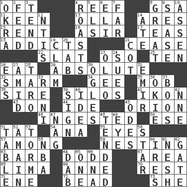 ACROSS 1. Often (poetically) 4. Coral ridge 8. Girls' org. (abbr.) 11. Peachy ____! 13. Spanish pot 14. Ancient Greek god of war 15. Monthly bill 16. SW Saudi Arabia district 17. Beverages made from leaves 18. Inveterate users 21. Stop 22. Narrow board 23. Bear (Spanish) 25. Nine, plus one 26. Erode 29. Utter; complete 32. Excessive but superficial compliments 34. Turn to the right 35. Disorderly crowd 38. Title for a man of rank and authority 39. Grain storage towers 41. Picture 43. Spanish title 44. Binary compound 45. Constellation of myth 46. Eaten 50. Compass dir. 51. Make lace 54. Santa ___, CA 55. Sight organs 57. Amid 59. Snuggling 63. Sharp remark 64. Texas town _ City 67. Type of rug 68. Pale green bean 69. Singer Murray 70. Take ten 71. Compass dir. 72. Necklace unit 73. A female animal or person DOWN 1. Gumbo ingredient 2. Nourish 3. Be inclined (to) 4. Exposes to great heat 5. Raised railways 6. Biblical high priest 7. Distant 8. Relatively large 9. Gospel singer Marvin 10. NE Netherlands city 12. Nuclear Threat Initiatives 14. Had dinner 19. Dollar (slang) 20. Keyboard key 21. Small bed 23. Margarine 24. Institutes legal proceedings 26. Double-curved letter 27. Among 28. Edible starchy tuberous root 30. Stares 31. Independent ruler or chieftain 33. Painter Guido (1575-1642) 36. Migrant worker of the '30s 37. Expressions of contempt or scorn 39. Public display of a written message 40. It may be bright or harebrained 42. Compass dir. 45. Lyric poems 47. Tired old horse 48. Watched over 49. Sight organ 51. Eating place 52. With great haste 53. Singer Mel 56. Play the lead 58. Basketball assoc. 60. Angers 61. Soft 62. Yard entry 64. Pat or tap gently 65. Single 66. Heredity factor (abbr.)