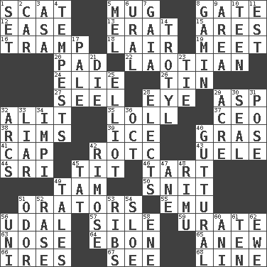 ACROSS 1. Scram, to a cat 5. Java container 8. Yard entry 12. Comfort 13. Part of Q.E.F. 15. Ancient Greek god of war 16. _____ steamer (cargo ship) 18. Den 19. Confront 20. Writing tablet 22. Of or relating to Laos or its people 24. Writer Wiesel 26. Metal container 27. Stitch closed the eyes of (a falcon) 28. Sight organ 29. Viper 32. Came down and settled, as after flight 35. Hang loosely or laxly 37. Corporate head (abbr.) 38. Basketball hoops 39. Frozen water 40. Pate de foie ____ 41. Head covering 42. College mil. group 43. Ubangi River tributary 44. _ Lanka 45. Teat (slang) 46. Small pie 49. Scottish cap 50. In a ____ (agitated or irritated) 51. Speakers 55. Australian flightless bird 56. Hereditary estate 57. Drop; flow; fall 59. A salt of uric acid 63. Characteristic smell of wine 64. Inky black, to poets 65. Afresh 66. Angers 67. Perceive with the eye 68. Actor's bit DOWN 1. Put into a specified state 2. Automobile 3. White ___ sheet 4. Storms 5. Cartoonist voice _ Blanc 6. Mountain range 7. Greek goddess of the earth (variant) 8. Homeless child 9. Type of rug 10. Adolescent 11. Eastern Standard Time (abbr.) 14. TNT 17. Diluted with white 21. Pass on 23. Standoff 25. American author Paul (1891-1958) 28. Chooses 29. Land measure 30. Lick closed 31. Introduce or present, as a question 32. Arches 33. One who doesn't tell the truth 34. Body of Kaffir warriors 36. Sep. follower 40. From the throat 42. Full of chinks, cracks, or crevices 45. Make lace 47. One (Scot) 48. Tall New Zealand timber tree 49. Stories 51. Aroma 52. To erase 53. Teases 54. A type of plum 56. University (slang) 58. Compass dir. 60. Black tropical American cuckoo 61. "___ Little Indians" 62. She-sheep