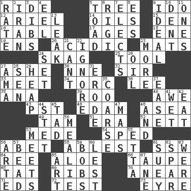 ACROSS 1. Travel on an animal 5. Woody plant 9. Wedding promise 12. Satellite of Uranus 14. Petroleums 15. Lair 16. Eating place 17. Ripens 18. Compass dir. 19. Followers of ems 20. Being or containing an acid 23. Floor protectors 24. Heroin 25. Instrument 27. American tennis player Robert 30. Compass dir. 32. Title for a knight 33. Confront 34. Torque (variant) 36. Area sheltered from the wind 38. Santa ___, CA 39. Friend of Pooh 40. Deep reverence 43. Pacific Standard Time (abbr.) 46. Dutch treat 48. Toward the sea 49. Scottish cap 51. Period 52. Remaining after all deductions 53. Ancient Persian 54. Moved rapidly 56. Collude with 58. Most capable 61. Compass dir. 64. To riddle 65. Medicinal plant 66. Grayish beige 68. Make lace 69. Chest bones 70. Approach 71. Begley and Asner 72. Trial 73. Jane of fiction DOWN 1. Assign a rank or rating to 2. SW Asia republic 3. Rights 4. Snakelike fish 5. Frog relative 6. Swiss mountan, "Queen of the Mountains" 7. Opts 8. Double-curved letter 9. Perfect 10. Gouge 11. Singles 13. Path through which fluid escapes 21. Patter 22. Disregard 23. Greater amount 24. Arrange properly for use 26. Petroleum 27. Wet nurse (var.) 28. Elected rep. 29. Pile 31. Eat (away) 35. Rough 37. Relaxation 41. Dripping 42. Erode 44. Proofreading order 45. Small amount or degree 47. Atlas contents 48. Added to 50. Ear of corn 53. Confronts 55. Singer James 56. Johnson of "Laugh-In" 57. Necklace unit 59. Moves up and down 60. For fear that 61. Chop _ 62. Coast Guard woman 63. Past tense of be (plural) 65. Tate display 67. One (Scot)