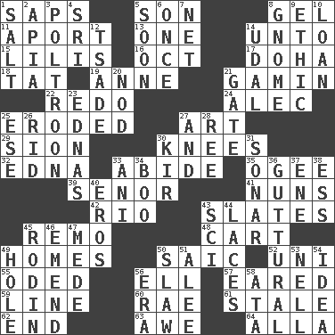 ACROSS 1. Plant excrements 5. Boy, to dad 8. Set 11. To the left, to Queeg 13. Single 14. To (old English) 15. Ms. Damita and namesakes 16. Sep. follower 17. Capital of the state of Qatar 18. Make lace 19. Queen of England 1702-14 21. Homeless child 22. Make new 24. Actor Baldwin 25. Eaten away 27. Tate display 29. The Jewish people; Israel 30. Leg joints 32. Pulitzer Prize-winning author Ferber 33. Stay 35. Double curve, resembling the letter S 39. Sir (Sp.) 41. Religious women 42. _ de Janeiro 43. Chalkboards 45. San ____ (Riviera town) 48. Heavy open wagon 49. Residences 50. Ketch in the Levant 52. Single; one (prefix) 55. Wrote a lyric poem 56. Pipe bend 57. Having ears or earlike features 59. Actor's bit 60. Actress Charlotte 61. Lacking originality or spontaneity 62. Conclusion 63. Deep reverence 64. Silent film actress Nazimova DOWN 1. Table seasoning 2. Capital of Western Samoa 3. Coward 4. _ Lanka 5. Within a short period 6. At one time in the past 7. Fish or hair follower 8. Dwarf 9. Principle of right and wrong 10. Grant temporary use of 12. Sadhe (variant) 14. Allodial 20. Dreamland 21. Yard entry 23. Ferber et al. 25. Compass dir. 26. To free from 27. Added to 28. To sift 30. Apertif with cassis 31. Echolocation 33. Cuckoo 34. Oct. 31 cry 36. From the throat 37. Compass dir. 38. Curvy letter 40. Greek god of love 43. _-fi 44. Shoestrings 45. "The Thinker" sculptor 46. Make improvements or corrections to 47. Ancient Persian 49. Opening into or through something 50. Cole _ (cabbage dish) 51. Toward shelter 53. 1994 drama film starring Jodie Foster 54. The content of cognition 56. Epoch 58. "One Day ___ Time"