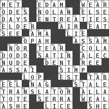 ACROSS 1. Was introduced to 4. Dutch treat 8. Put on (as clothing) 12. Lyric poems 14. Pitcher Ryan 16. Otherwise 17. 24-hour periods 18. Pleas 20. A person who is older than you are 22. Atmosphere 23. Ingest 24. Observe 25. Nanny (var.) 28. Untruth 30. Brightly colored fish 31. Indian state 35. Or not 37. Pull apart 40. Root beer relative 41. Texas town _ City 42. Smooth fabric 44. Actor Baldwin 45. Unadorned 46. Incision 47. Portuguese money of account (variant) 48. Slender Brazilian palm 50. Simple or foolish person 52. Trim (branches) 54. Eastern Standard Time (abbr.) 55. Bar bill 58. Snakelike fish 61. Tired old horse 63. Lacking originality or spontaneity 65. Interpreter 70. Silent film actress Nazimova 71. Carryall 72. Spanish missionary in California 73. Welt 74. American tennis player Robert 75. Louse (plural) 76. A female animal or person DOWN 1. Methods 2. Peak District village in England 3. Miss Universe 1986, Barbara Palacios _ 4. Compass dir. 5. Spanish title 6. Keyboard modifier key 7. Hindu Mythology: god of death 8. Soggy 9. Writer Wiesel 10. At sea 11. Remainder 13. Compass dir. 15. Famous astronaut Armstrong 19. Operatic vocal solo 21. Reproach for some lapse or misdeed 26. Floor protectors 27. Having the leading position 29. Fortification 30. Severe or trying experience 32. Flatfish 33. Toward shelter 34. Apple computer (short form) 35. Common sense 36. Likelihood 38. Had dinner 39. Wash lightly 41. Heredity factor (abbr.) 43. Nuclear Threat Initiatives 49. Charged particles 51. Mountains (abbr.) 53. Friends 55. Falsehoods 56. Assad's deity 57. Calif. Air Force Base 58. Singer James 59. Greek god of love 60. Thin strip of wood or metal 62. Highlander 64. The 23rd letter of the Hebrew alphabet 66. Born 67. Three (prefix) 68. The grampus (Milton) 69. Actress Charlotte