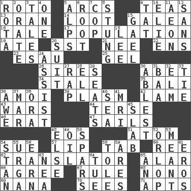 ACROSS 1. Printing process, for short 5. Curves 9. Beverages made from leaves 13. NW Algerian seaport 14. Spoils 15. An organ shaped like a helmet 16. Story 17. Census information 19. Had dinner 20. Fast jet (abbr.) 21. Born 22. Followers of ems 23. Son of Isaac 25. Set 26. Male parents of animals 30. Collude with 34. Lacking originality or spontaneity 35. Indonesian resort city 36. Mine, in Marseilles 39. Suffix with ecto or cyto 42. Unable to walk 43. Armed conflicts 44. Laconic 46. Part of Q.E.F. 47. Moves on water 48. Greek goddess of the dawn 51. Tiny particle 54. Institute legal proceedings 57. Mouth edge 58. Keyboard key 60. To sift 62. Interpreter 65. Having or resembling wings 66. Match 67. General guideline 68. Words to Nanette 69. Nanny 70. Observes 71. Flats, for short DOWN 1. Roll call or roster of names 2. Speak pompously 3. Falsehoods 4. Single 5. High mountains 6. Carrot, for example 7. Police officer (slang) 8. Feeling sharp psychological pain 9. Make lace 10. Writer Wiesel 11. Period of immesurable duration 12. Without 15. Highlander 18. Area sheltered from the wind 20. Set or collection 24. Aid 27. Hit sharply and swiftly 28. Pipe bend 29. Theater features 30. Most capable 31. Sound made by sheep 32. Shade tree 33. Make a knot 36. Deep reverence 37. Make imperfect 38. Mouth or opening 40. Ocean 41. Medical imaging device (abbr.) 45. Thick slice 48. Otherwise 49. Lubricate 50. Practice fights 52. Fourth or lowest deck 53. Intended 54. Comedian Laurel of Laurel & Hardy 55. Capital and largest city of Mongolia 56. Merit 58. Lacquered or enameled metalware 59. Ancient Greek god of war 61. Greek god of love 63. Teachers' org. 64. Third day of the wk. 65. Santa ___, CA