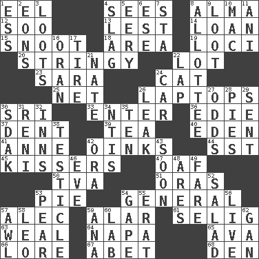 ACROSS 1. Snakelike fish 4. Perceives with the eye 8. _ mater 12. "Barney Miller" actor Jack 13. For fear that 14. Grant temporary use of 15. Snout, nose 18. Length times width 19. Locales 20. Slender, wiry 22. Car dealer's back yard 23. "Two Mules for Sister ____" 24. Domesticated feline 25. Fish or hair follower 26. Portable computers 30. Indian title of respect (Mr.) 33. Keyboard key 36. Singer Brickell 37. Gouge 39. Afternoon social gathering 40. Paradise 41. Singer Murray 42. Pig sounds 44. Fast jet (abbr.) 45. Smoochers 47. Clumsy lout 50. Federal power corp. 51. Mouths or openings 53. Sliced dessert 54. Commissioned military rank 57. Actor Baldwin 59. Having or resembling wings 61. Major League Baseball Commissioner Bud 63. Welt 64. California wine valley 65. Actress Gardner 66. Old wives' tales, e.g. 67. Collude with 68. Lair DOWN 1. Double-curved letter 2. Immeasurably long periods of time 3. Plunders 4. Volcanic refuse 5. Suggestive of the supernatural 6. Compass dir. 7. R.R. building 8. One to whom something is allotted 9. Spoils 10. Big _ 11. Cuckoo 16. Northwest Algerian city 17. Hoop that covers a wheel 21. Nathan's nickname 22. Pet locale 24. 4-wheeled motor vehicle 26. Path through which fluid escapes 27. Likelihood 28. Sliced desserts 29. Emitted 30. Neighbor of Neb. 31. Painter Guido (1575-1642) 32. Restaurants 34. Nuclear Threat Initiatives 35. Nine, plus one 38. One of the two male reproductive glands 42. Mouth or opening 43. Within a short period 46. First lady 48. Ancient Greek god of war 49. Conductor's collection 52. Vegetable dish 53. Lightbulb-shaped fruit 54. Open wide 55. Part of Q.E.F. 56. Not recorded 57. Leather borer 58. Lion 59. Santa ___, CA 60. Experiment locale 62. Separate the seeds from cotton