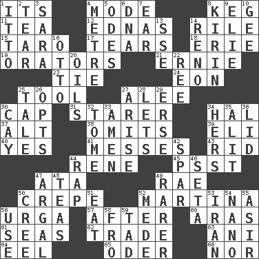 ACROSS 1. It is 4. Method 8. Cask 11. Afternoon social gathering 12. Ferber et al. 14. Cause heat under the collar 15. Pacific island yam 17. Rends 18. One of the Great Lakes 19. Speakers 21. Bert's buddy 23. Neckwear 24. Period of immesurable duration 25. Implement 27. Toward shelter 30. Head covering 31. A viewer who gazes fixedly 34. Actor Linden 37. Keyboard modifier key 38. Leaves out 39. Connecticut Ivy Leaguer 40. Affirmative reply 41. Makes clutter 43. To free from 44. French philosopher Descartes 45. Inconspicuous attention getter 47. _ moment's notice (2 wds.) 49. Actress Charlotte 50. Streamer paper 52. Chrissie's court nemesis 56. Capital and largest city of Mongolia 57. Following 60. Ancient river in northeast Turkey 61. Oceans 62. Buy and sell 63. Black tropical American cuckoo 64. Snakelike fish 65. Baltic tributary 66. Not either DOWN 1. "Tell ____ the Marines!" 2. Rend 3. "Two Mules for Sister ____" 4. Distance measurement (Brit.) 5. Lyric poems 6. Heredity factor (abbr.) 7. Ewer handle 8. Japanese brewing company 9. Writer Wiesel 10. Turn to the right 13. Compass dir. 14. Western Nevada city 16. "Beetle Bailey" pooch 20. Lubricates 22. To separate or throw off 25. Falsehood 26. Elects 27. Originate 28. Allows 29. Celtic language 30. Island 32. Heavy book 33. So be it 34. Possessive pronoun 35. Came down and settled, as after flight 36. Hat (slang) 42. Practice fight 44. Reproach for some lapse or misdeed 46. Bristle 47. Therefore, facetiously 48. Beverages made from leaves 49. More uncommon 50. Algonquian 51. Consume 52. Ancient Persian 53. SW Asia republic 54. Billionth: prefix 55. SW Saudi Arabia district 56. Purpose 58. Away 59. Small boy