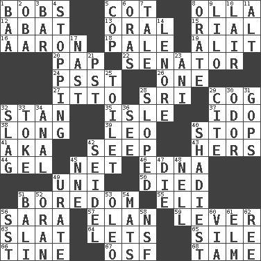 ACROSS 1. Moves up and down 5. Small bed 8. Spanish pot 12. Blind as ____ 13. Spoken 15. Monetary unit of Yemen 16. Composer Copland 18. Light colored 19. Set down 20. Infant food 22. Elected representative 24. Inconspicuous attention getter 26. Single 27. "Tell ____ the Marines!" 28. Indian title of respect (Mr.) 29. Gear tooth 32. Comedian Laurel of Laurel & Hardy 35. Small island 37. Wedding promise 38. Having great length 39. Lion 40. Discontinue 41. Alias (abbr.) 42. Ooze 43. Possessive pronoun 44. Set 45. Fish or hair follower 46. Pulitzer Prize-winning author Ferber 49. University (slang) 50. Passed on 51. Mood resulting from idleness 55. Connecticut Ivy Leaguer 56. "Two Mules for Sister ____" 57. Flair 59. Prying instrument 63. Narrow board 64. Allows 65. Filth; sediment 66. Prong on a fork 67. Order of Saint Francis (abbr.) 68. Docile DOWN 1. Sound made by sheep 2. Chief or king in Benin or Nigeria 3. Tavern 4. Closing up, plugging up 5. Police officer (slang) 6. Mouths or openings 7. Lie 8. Speak pompously 9. _ and Stitch 10. Den 11. Keyboard modifier key 14. Poe poem 17. Political cartoonist Thomas 21. Pacific Standard Time (abbr.) 23. Black tropical American cuckoo 25. Bathroom plumbing fixture 28. Inclined 29. Quote 30. Aroma 31. Republicans 32. Volcanic refuse 33. Casino tip 34. Of or related to the anus 36. Observe 40. Most dark, concealed or hidden 42. Beer mug 45. Compass dir. 47. Expire 48. 1994 drama film starring Jodie Foster 49. A salt of uric acid 51. Indonesian resort city 52. NW Algerian seaport 53. Margarine 54. Floor protectors 56. Fast jet (abbr.) 58. Overdraft (abbr.) 60. By way of 61. Shade tree 62. To riddle