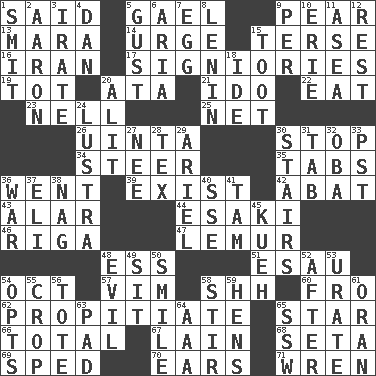 ACROSS 1. Stated 5. Highlander 9. Lightbulb-shaped fruit 13. Hindu Mythology: god of death 14. Goad 15. Laconic 16. SW Asia republic 17. Seigniories (variant) 19. Small child 20. "One Day ___ Time" 21. Wedding promise 22. Erode 23. 1994 drama film starring Jodie Foster 25. Fish or hair follower 26. National forest in Provo, Utah 30. Close up, plug up 34. Bull 35. Bar bills 36. Gone 39. Be 42. Blind as ____ 43. Having or resembling wings 44. 1973 Nobel Price Winner (Physics) Leo 46. Capital of Latvia 47. Arboreal primate 48. Double-curved letter 51. He sold his birthright 54. Sep. follower 57. Zeal 58. Quiet! 60. Back 62. Conciliate 65. Play the lead 66. Add up to 67. (Had) reclined 68. Bristle 69. Hurried 70. Hearing organs 71. Songbird DOWN 1. Stricken, poetically 2. Composer Copland 3. Feeling or showing extreme anger 4. Daniel's nick name 5. Abrupt rush of wind 6. Operatic vocal solo 7. Ovum 8. Soviet premier 1918-24 9. For each 10. 4th largest of the Great Lakes 11. At sea 12. Take ten 15. A blast of a horn 18. Binary compound 20. Set down 24. A period of five years 27. Born 28. John Ritter's dad 29. Satellite of Uranus 30. Flight of steps 31. Keyboard key 32. Chief or king in Benin or Nigeria 33. Pacific Standard Time (abbr.) 36. Armed conflict 37. Biblical high priest 38. Tired old horse 40. Compass dir. 41. Scottish cap 45. Malaysian steamed pastry 48. Tending to cause great harm 49. Be seated 50. Grin 52. Following 53. A salt of uric acid 54. Chooses 55. Riding implement 56. Carry 58. Move through with a circular motion 59. Coop moms 61. NW Algerian seaport 63. Groovy apt. 64. Auto club (abbr.) 65. Compass dir.