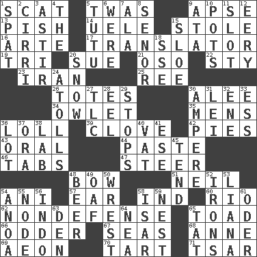 ACROSS 1. Leave at once 5. It was, poetically 9. Domed church section 13. Expression of disdain 14. Ubangi River tributary 15. Took without asking 16. Johnson of "Laugh-In" 17. Interpreter 19. Three (prefix) 20. Institute legal proceedings 21. Bear (Spanish) 22. Filthy place 23. SW Asia republic 25. To separate or throw off 26. Hauls 30. Toward shelter 34. A small or young owl 35. Not women's 36. Hang loosely or laxly 39. Garlic unit 42. Sliced desserts 43. Relating to the mouth 44. Thick mixture 46. Bar bills 47. Navigate 48. Arrow shooter 51. Famous astronaut Armstrong 54. Cuckoo 57. Hearing organ 58. Indiana (abbr.) 60. _ de Janeiro 62. Unrelated to defense, as in spending 65. Frog relative 66. More peculiar 67. Oceans 68. Singer Murray 69. Age 70. Small pie 71. Russian ruler of old DOWN 1. Argument over a trivial matter 2. High-altitude cloud 3. Having gotten out of bed 4. Definite Article 5. Ballerina skirt 6. Past tense of be (plural) 7. In the manner of 8. Sir (Sp.) 9. _ moment's notice (2 wds.) 10. Cooking vessels 11. Narrow, elongated depression 12. Suggestive of the supernatural 15. _ gin 18. Compass dir. 20. Overwhelm 24. Ringlike coral islands and reefs 27. Affectionate concern, for short 28. Snakelike fish 29. Discontinues 30. Electrical Unit 31. Luau accessory 32. Compass dir. 33. Curvy letter 36. Car dealer's back yard 37. Mouth or opening 38. Experiment locale 40. Large container 41. Compass dir. 45. Watch over 48. Fermented drink made from hops 49. Clumsy lout 50. Take or capture by force 52. Metal shackles 53. Climbing, woody, usually tropical vines 54. Small Philippine buffalo 55. Thickened enlargement 56. Southeast Asian peninsula 58. Austrian river, tributary to the Danube 59. A home for chicks 61. Baltic tributary 63. Lair 64. Teachers' org. 65. Make lace