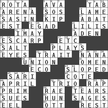 ACROSS 1. Roll call or roster of names 5. Actress Gardner 8. Bar bill 11. Sports stadium 13. Distress signal 14. Unable to walk 15. Indian antelope 16. Monetary unit of Laos 17. Blind as ____ 18. Eastern Standard Time (abbr.) 19. Mild oath 21. Ms. Damita and namesakes 22. "If ____ say so..." 24. Arabian gulf 25. Fortification 27. And so on (abbr.) 29. Table seasoning 30. Romps 32. Snake ____ (dice throw) 33. Distinguishing feature 35. Grandmother 39. The state of being joined or united 41. Sign of things to come 42. Environmental prefix 43. Inclined 45. Indian skirt 48. ____ d'Azur (French Riviera) 49. Showery time 50. Musical group of three 52. Reproach for some lapse or misdeed 55. Demure 56. Actress Charlotte 57. Pulls apart 59. Takes to court 60. Attila the _ 61. Gurus 62. Snakelike fish 63. Baseball player Mel 64. Relief DOWN 1. To erase 2. Mouths or openings 3. A testis 4. Cuckoo 5. "____ silly question..." 6. Empty area or space 7. Cleo's killer 8. Eating place 9. At full speed 10. Wagers 12. Approach 14. Put down 20. Con 21. Made of lace 23. Taiwanese island in East China Sea 25. Compass dir. 26. Declare 27. Biblical high priest 28. Make lace 30. Baking dish 31. Snout, nose 33. Nervous spasm 34. Friend of Pooh 36. Electrical Measurement 37. Born 38. Plus 40. Famous astronaut Armstrong 43. _-fi 44. Plunders 45. Upset 46. Satellite of Uranus 47. Basketball hoops 49. Domed church section 50. Pulled tight 51. Monthly bill 53. Ancient Greek god of war 54. Inconspicuous attention getter 56. 17th letter of the Greek alphabet 58. Ewer handle
