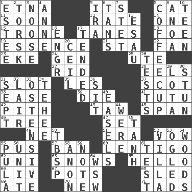 ACROSS 1. Inactive volcano in Sicily 5. It is 8. Domesticated feline 11. Within a short period 12. Pace 14. Single 15. Heavy duty weighing machine 17. Makes less strong or intense 18. Enemy 19. Substance 21. R.R. building 22. Avid follower 23. Supplement with great effort 24. Commissioned military rank (abbr.) 25. Shoshoni 27. To free from 28. Snakelike fish 31. Groove 35. French article 37. Highlander 38. Comfort 39. Pass on 41. Ballerina skirt 42. Essential or central part 43. The 23rd letter of the Hebrew alphabet 45. Connect, as a bridge 46. Family _ (genealogy) 47. Put into a specified state 49. Fish or hair follower 51. Period 52. Solemn pledge 55. Tenth month of the Hindu calendar 57. Forbid 60. Small, flat, pigmented spot on the skin 62. University (slang) 63. Overwhelms 65. Phone greeting 66. 54 in ancient Rome 67. Plant holders 68. Downhill vehicle 69. Had dinner 70. ___ Haven, CT 71. Small boys DOWN 1. First name in cosmetics 2. Cod relative 3. Trap for birds or small mammals 4. Queen of England 1702-14 5. Lyricist Gershwin 6. Scottish caps 7. Proofreading order 8. Java holder (2 wds.) 9. Small Philippine buffalo 10. Adolescent 13. He sold his birthright 16. Engineer (abbr.) 17. Watched over 20. To provide with a ceiling 26. Trials 29. Globular water bottle used in Asia 30. Make senseless or dizzy 31. Back-to-school mo. 32. Den 33. Clearly or manifestly demonstrative 34. Giggle 36. Be seated 40. Artist's stands 44. We are 48. Hyperbolic tangent 50. Cook's measure (abbr.) 52. Country estate 53. Stared 54. Forest 55. Monetary unit of Botswana 56. A single undivided whole 58. At once, immediately (arch.) 59. Short letter 61. Trial 64. Compass dir.