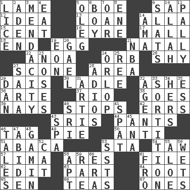 ACROSS 1. Unable to walk 5. Mitch Miller's instrument 9. Plant excrement 12. It may be bright or harebrained 13. Grant temporary use of 14. Silent film actress Nazimova 15. Penny 16. Jane of fiction 17. Promenade 18. Conclude 19. Ovum 21. Brizilian seaport 22. Small Philippine buffalo 24. Globe 26. Like a shrinking violet 27. Biscuitlike quick bread 28. Length times width 29. Raised platform 30. Dipping utensil 32. American tennis player Robert 36. Johnson of "Laugh-In" 37. _ de Janeiro 38. Moves 39. Negative votes 40. Constricts 42. Blunders 43. Indian titles of respect 44. Leg coverings 46. Label 49. Sliced dessert 50. Against 51. Phillipine bananalike plant 53. R.R. building 54. The 23rd letter of the Hebrew alphabet 57. Pale green bean 58. Ancient Greek god of war 61. Do some clerical work 62. Prepare for publication 63. Piece 64. Carrot, for example 65. Elected rep. 66. Afternoon social gatherings 67. Singles DOWN 1. Louse (plural) 2. An important port of Yemen 3. Ananias' fault 4. Ingest 5. Cassini of fashion 6. Male child 7. Rowing implement 8. Compass dir. 9. Narrow boards 10. Assad's deity 11. Friendly 14. Nanny (var.) 19. Period of immesurable duration 20. Highlander 21. Basketball assoc. 23. Olfactory organs 24. Lowest deck of a ship 25. To riddle 27. "Two Mules for Sister ____" 28. Goodbye (Sp.) 29. One of the 12 tribes of Israel 31. Nick name for Arthur 32. Representative 33. Decision 34. Possessive pronoun 35. Double-curved letter 40. Indian title of respect (Mr.) 41. Argument over a trivial matter 43. Health resort 45. Santa ___, CA 46. Falsehoods 47. Remain 48. Street urchin 52. Feline 53. Fast planes 55. _ vera 56. Moistens 58. Fitting 59. Actress Charlotte 60. Period 61. Back