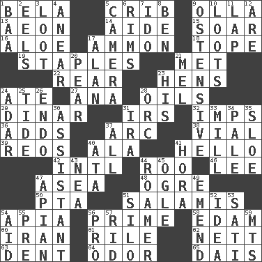 ACROSS 1. Actor Lugosi 5. Baby bed with high sides 9. Water jar 13. Period of immesurable duration 14. Assistant 15. Fly high 16. _ vera 17. ID or VA city 18. Drink excessively 19. Paper fasteners 21. Was introduced to 22. Buttocks 23. Coop moms 24. Had dinner 27. Santa ___, CA 28. Petroleums 29. Middle Eastern gold or silver currency 31. Big collection agency 32. Naughty children 36. Does sums 37. Curve 38. Small bottle 39. Vintage cars 40. Insect wing 41. Phone greeting 42. International (abbr.) 44. Friend of Pooh 46. Area sheltered from the wind 47. At sea 48. Legendary monster 50. Parent Teacher Assoc. 51. Deli grouping 54. Capital of Western Samoa 56. A-one 58. Dutch treat 60. SW Asia republic 61. Cause heat under the collar 62. Remaining after all deductions 63. Gouge 64. Aroma 65. Raised platform DOWN 1. Sound made by sheep 2. Snakelike fish 3. Plunder 4. Approach 5. Device for capturing images 6. Basketball hoops 7. Wedding promise 8. Benjamin's nick name 9. Clearly or manifestly demonstrative 10. Plunders 11. Infant locale 12. "We ___ not amused" (Victoria) 17. Actor Alda or Thicke 20. Lightbulb-shaped fruit 21. Cartoonist voice _ Blanc 23. Part of HMS, perhaps 24. The sixth month of the Jewish calendar 25. Periodic rise and fall of the sea level 26. Inside; within (prefix) 28. The grampus (Milton) 30. Helper 31. Retirement account (abbr.) 33. Place where flour is made 34. Diluted with white 35. A type of plum 37. Everything 40. "One Day ___ Time" 41. Israeli folk dance 43. Teachers' org. 44. Nomad 45. Stare 47. Bee-related 49. Make improvements or corrections to 51. Grain storage tower 52. The content of cognition 53. Suttee (variant) 54. Assist 55. Before (prefix) 56. Adept person 57. To free from 59. Mountains (abbr.)