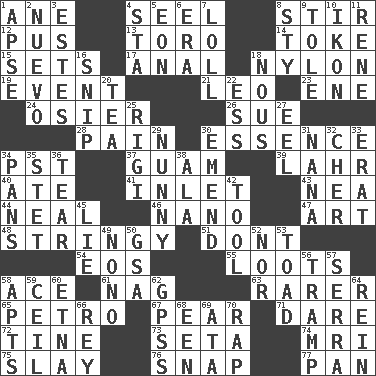 ACROSS 1. A saturated hydrocarbon 4. Sew up the eyelids of hawks and falcons 8. Use a spoon 12. Fluid product of inflammation 13. "Corrida" creature 14. Casino tip 15. Arranges properly for use 17. Of or related to the anus 18. High-strength synthetic material 19. Happening 21. Lion 23. Compass dir. 24. Flexible twig of a willow tree 26. Institute legal proceedings 28. Ache 30. Substance 34. Pacific Standard Time (abbr.) 37. Island territory of the United States 39. Cowardly lion portrayer 40. Had dinner 41. An arm off of a larger body of water 43. Teachers' org. 44. Actress Patricia 46. Billionth: prefix 47. Nonscientific branch of learning 48. Slender, wiry 51. Do not 54. Greek goddess of the dawn 55. Plunders 58. Adept person 61. Tired old horse 63. More valued for its uncommonness 65. Stone: prefix 67. Lightbulb-shaped fruit 71. Have the gumption 72. Prong on a fork 73. Stalk of a moss capsule 74. Medical imaging device (abbr.) 75. Kill 76. Fastener 77. Baking dish DOWN 1. Domed church section 2. New (sp.) 3. _____ Park, CO 4. R.R. building 5. Age 6. Period 7. Hang loosely or laxly 8. Filthy place 9. Lacquered or enameled metalware 10. Visual representation of an object 11. French philosopher Descartes 16. Sever or remove by pinching or nipping 18. Good sense 20. Afternoon social gathering 22. Curvy letter 25. Swiss mountan, "Queen of the Mountains" 27. Snakelike fish 29. Pet term 30. Make improvements or corrections to 31. Grandmother 32. "Mermaids" star 33. Part of Q.E.F. 34. Zero-star reviews 35. Proofreading order 36. Lacerate 38. Chicken ___ king 42. Utensil 45. Whopper 49. Words to Nanette 50. Girls' org. (abbr.) 52. Or not 53. Frog relative 56. _____ steamer (cargo ship) 57. Father Junipero _ 58. Tenement units (abbr.) 59. To provide with a ceiling 60. Inactive volcano in Sicily 62. Global Positioning Systems (abbr.) 64. It's straight from the horse's mouth 66. Marina Del _, California 68. Car or cant ending 69. _ moment's notice (2 wds.) 70. Hit sharply and swiftly