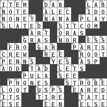 ACROSS 1. A whole individual unit 5. Pat or tap gently 8. Experiment locale 11. Musical sound 12. Actor Baldwin 14. Wedding promise 15. Music written for nine 17. Nanny 18. Romp 19. Scheduled 21. "Cheers" or "Ellen" 23. Tate display 25. Mouths or openings 26. Pate de foie ____ 27. Not either 28. Curvy letter 31. Away 33. Slender fish 35. Components 37. Group working together 38. To riddle 40. Carrot, for example 41. Actor Sean's family 43. It is so 45. Cleo's killer 46. Find the sum of 47. Bit 50. Allows 52. Monetary unit of Botswana 53. Observe 54. Gives a jingle 56. Disco prop 61. Spoils 62. United States Postal Service (abbr.) 65. Having ears or earlike features 66. ___ a Wonderful Life 67. Become fatigued 68. Jacques of French films 69. Compass dir. 70. Car or cant ending 71. Otherwise DOWN 1. Lodging establishments 2. Implement 3. Inactive volcano in Sicily 4. Confront 5. Daniel's nick name 6. Wing 7. Gillaume's butler role 8. _ and Stitch 9. First of billions? 10. Male child 13. Capital of Egypt 16. Separate forcefully 18. Personal Computers (abbr.) 20. To be drawn or hauled along 22. Canvas cover 24. Russian ruler of old 26. Long dress 28. Greek god of love 29. Discontinue 30. Fast jet (abbr.) 31. Flintstone 32. Tear apart 34. Marina Del _, California 36. Ancient river in northeast Turkey 37. Numbers guy (abbr.) 39. Snakelike fish 42. Make senseless or dizzy 44. Perceives with the eye 48. Native American of Southwest Alaska 49. Small ungulate mammals of Africa 51. False hair 52. Plant holder 54. Cooking vessels 55. Stockings 57. Pace 58. Spoken 59. Stakes 60. Singer Brickell 61. Whopper 63. Before (prefix) 64. Elected rep.