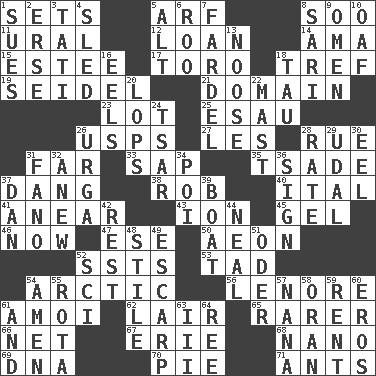 ACROSS 1. Puts into a specified state 5. Sandy's bark 8. "Barney Miller" actor Jack 11. Mountain range 12. Grant temporary use of 14. Wet nurse (var.) 15. First name in cosmetics 17. "Corrida" creature 18. Not kosher 19. A glass for beer 21. Realm 23. Car dealer's back yard 25. Son of Isaac 26. United States Postal Service (abbr.) 27. French article 28. Sorrow 31. At a great distance 33. Plant excrement 35. Sadhe (variant) 37. Mild oath, euphamism for damn 38. Director Reiner 40. Slanted text style (abbr.) 41. Approach 43. Electrically charged atom 45. Set 46. Immediately 47. Compass dir. 50. Period of immesurable duration 52. Fast planes 53. Small amount or degree 54. Northern region 56. Poe poem 61. Mine, in Marseilles 62. Den 65. More uncommon 66. Fish or hair follower 67. One of the Great Lakes 68. Billionth: prefix 69. Heredity factor (abbr.) 70. Sliced dessert 71. Pismires DOWN 1. Institutes legal proceedings 2. Celtic language 3. Jacques of French films 4. Downhill vehicle 5. The first octave above the treble staff 6. Friend of Pooh 7. Burden 8. Indian skirt 9. Presage 10. Clumsy lout 13. Trap for birds or small mammals 16. Snakelike fish 18. The 19th letter of the Greek alphabet 20. Chops off 22. Vertical spar for supporting sails 24. Russian ruler of old 26. Capital and largest city of Mongolia 28. Pace 29. Hereditary estate 30. Snakelike fish 31. Papal veil 32. Afresh 34. Luau course 36. Attach a signature 37. One of the 12 tribes of Israel 39. Water vessel 42. Remainder 44. Anneal 48. Vertical member of a panel or frame 49. Fortification 51. Baltic tributary 52. _-fi 54. So be it 55. Roll call or roster of names 57. Nanny 58. NW Algerian seaport 59. Monthly bill 60. Greek god of love 61. Added to 63. One more than two 64. Portuguese money of account (variant)