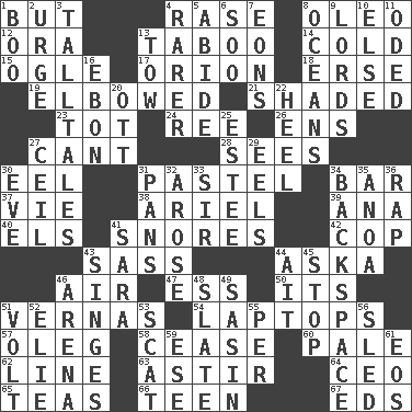 ACROSS 1. With the exception that 4. Raze (variant) 8. Butter sub 12. Mouth or opening 13. Off limits 14. Chilled 15. Stare 17. Greek mythologigal hunter 18. Celtic language 19. Turned at an angle; bent 21. Cast a shadow over 23. Small child 24. To sift 26. Followers of ems 27. Patter 28. Perceives with the eye 30. Snakelike fish 31. Soft color 34. Oblong piece of solid material 37. Compete 38. Satellite of Uranus 39. Santa ___, CA 40. Raised railways 41. Sounds asleep 42. Police officer (slang) 43. Backtalk 44. "____ silly question..." 46. Atmosphere 47. Curvy letter 50. ___ a Wonderful Life 51. Actresses Bloom and Felton 54. Portable computers 57. Cassini of fashion 58. Stop 60. Light colored 62. Actor's bit 63. Being in motion 64. Corporate head (abbr.) 65. Afternoon social gatherings 66. Adolescent 67. Begley and Asner DOWN 1. Oct. 31 cry 2. Goad 3. Baron Munchausen's specialties 4. More valued for its uncommonness 5. Stay 6. "Barney Miller" actor Jack 7. Immeasurably long periods of time 8. Seas 9. Titled peers of a realm 10. Otherwise 11. Wrote a lyric poem 13. Pull behind 16. Inky black, to poets 20. Baseball player Mel 22. Person who is morally reprehensible 25. First name in cosmetics 27. To provide with a ceiling 29. Snakelike fish 30. Night before a holiday 31. Baking dishes 32. Came up 33. Title for a knight 34. Keyboard key 35. Small Philippine buffalo 36. Hit sharply and swiftly 41. "Two Mules for Sister ____" 43. Scorches 44. Small island 45. Constrict 46. Sports stadium 48. Schedule 49. Indian antelope 51. Electrical Unit 52. Writer Wiesel 53. Scram, to a cat 55. For each 56. Downhill vehicle 59. Compass dir. 61. Greek goddess of the dawn