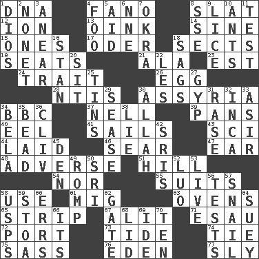 ACROSS 1. Heredity factor (abbr.) 4. Papal veil 8. Narrow board 12. Electrically charged atom 13. Pig sound 14. Trig term 15. Singles 17. Baltic tributary 18. Religious groups 19. Theater features 21. In the manner of 23. Eastern Standard Time (abbr.) 24. Distinguishing feature 26. Ovum 28. Nuclear Threat Initiatives 30. Nineveh was its capital 34. English channel? 37. 1994 drama film starring Jodie Foster 39. Zero-star reviews 40. Snakelike fish 41. Travel by water 43. _-fi 44. Put down 46. Dry up 47. Hearing organ 48. Contrary to your interests or welfare 51. Land elevation 54. Not either 55. Sets or collections 58. Purpose 61. Russian fighter aircraft 63. Baking chambers 65. Remove all contents or possession from 67. Came down and settled, as after flight 71. Son of Isaac 72. Left side of a ship or aircraft 73. Event that recurs at intervals 74. Make a knot 75. Backtalk 76. Paradise 77. Cunning DOWN 1. "Vaya con ____" 2. Music written for nine 3. Approach 4. Egg _ yung 5. Assist 6. Compass dir. 7. Gumbo ingredient 8. Compass dir. 9. Louse (plural) 10. Pismires 11. Trial 16. Comedian Laurel of Laurel & Hardy 18. Sinks 20. Be seated 22. French article 25. Canisters 27. Swindle 29. Gospel singer Marvin 30. Assad's deity 31. To erase 32. South American Indian 33. SW Saudi Arabia district 34. Actor Lugosi 35. Necklace unit 36. 154 in Roman numerals 38. Untruth 42. Indian titles of respect 45. Lair 49. Frolic 50. _ Lanka 52. Nilotic language 53. Not recorded 56. Trials 57. Slow-paced one 58. United States Postal Service (abbr.) 59. Portico 60. Blunders 62. Yard entry 64. Chop _ 66. ___ a Wonderful Life 68. Flaplike covering 69. Binary compound 70. "___ Little Indians"