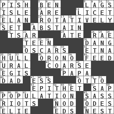 ACROSS 1. Expression of disdain 5. Benjamin's nick name 8. Fails to keep up a pace 12. Capri or Wight 13. "We ___ not amused" (Victoria) 14. It is permitted: Lat. 15. Flair 16. Happening in regular succession 19. Put into a specified state 20. Choose not to consume 21. Russian ruler of old 23. Had dinner 24. Actress Charlotte 27. Adolescent 30. Mild oath, euphamism for damn 31. Motion picture awards 34. Inactive volcano in Sicily 35. Frame or body of a ship 38. U. of Maine site 40. Nourish 41. Mountain range 42. Unrefined 44. Armor plate that protects the chest 45. Dad 46. June honoree 47. Double-curved letter 50. Von Bismarck 53. Curse 57. Plant excrement 59. Census information 63. Backtalk 64. Disturbances 65. Dreamland 66. Lyric poems 67. Writer Wiesel 68. Begley and Asner 69. Egg locale DOWN 1. Sliced desserts 2. Small island 3. Narrow boards 4. Layer 5. Sharp remark 6. Greek god of love 7. Remaining after all deductions 8. 54 in ancient Rome 9. Adept person 10. Set 11. Filthy place 14. Actor's bit 17. American Automobile Association (abbr.) 18. Teat (slang) 20. Ancient Greek god of war 22. Ringlike coral islands and reefs 24. Assign a rank or rating to 25. Singer Murray 26. Mild oath 28. Environmental prefix 29. Drug cop 30. Outscore 32. Friend of Pooh 33. Fastener 35. Became colored 36. Capital and largest city of Mongolia 37. Put down 39. Mouth or opening 43. Blemish 47. Snakelike fish 48. Health resort 49. Be seated 51. Sadhe (variant) 52. Fertile tracts in a desert 54. Prong on a fork 55. Parka part 56. Extremities 58. Inconspicuous attention getter 59. Before (prefix) 60. Petroleum 61. Luau course 62. Shoshoni 63. Boy, to dad