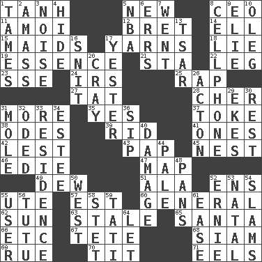 ACROSS 1. Hyperbolic tangent 5. ___ Haven, CT 8. Corporate head (abbr.) 11. Mine, in Marseilles 12. Cy Young winner Saberhagen 14. Pipe bend 15. Women servants 17. Tall tales 18. Whopper 19. Center 21. R.R. building 22. Part of a journey 23. Compass dir. 24. Big collection agency 25. Hit sharply and swiftly 27. Make lace 28. "Mermaids" star 31. Greater amount 35. Affirmative reply 37. Puff or smoke 38. Lyric poems 39. To free from 41. Washington bills 42. For fear that 43. Infant food 45. A home for chicks 46. Singer Brickell 47. Atlas unit 49. Morning condensation 51. Wing 52. Followers of ems 55. Shoshoni 57. Eastern Standard Time (abbr.) 60. Commissioned military rank 62. Player for Phoenix 63. Lacking originality or spontaneity 65. Before Barbara or Clara 66. And so on (abbr.) 67. False hair 68. Thailand, formerly 69. Regret 70. Teat (slang) 71. Snakelike fish DOWN 1. Domesticates 2. Collect or gather 3. Annoying sound 4. Flintstone garb 5. Basketball assoc. 6. Blunders 7. Gone 8. Portable communications device 9. Writer Wiesel 10. Cassini of fashion 13. Russian ruler of old 16. In a ____ (agitated or irritated) 17. Last past 20. Supercomputer manufacturer 26. 13-14th century defensive garment 29. Makes supply last 30. Take ten 31. Undercover agent 32. Wrote a lyric poem 33. Home 34. First name in cosmetics 36. Small drink 40. Break 44. Diluted with white 48. Zero-star reviews 50. 270 degrees 52. Bert's buddy 53. Brizilian seaport 54. Criticizes harshly 55. One who makes use of a thing 56. Ballerina skirt 58. Proofreading order 59. Jacques of French films 61. Relaxation 64. Allow