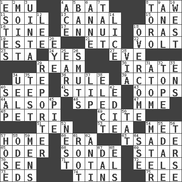 ACROSS 1. Australian flightless bird 4. Blind as ____ 8. The 23rd letter of the Hebrew alphabet 11. The visible part of the earth's surface 13. Lessep's creation 15. Single 16. Prong on a fork 17. World-weariness 18. Mouths or openings 19. First name in cosmetics 21. And so on (abbr.) 22. Electrical Unit 23. R.R. building 24. Consenting reply 27. First lady 29. 480, 500 or 516 sheets of paper 30. Feeling or showing extreme anger 34. Shoshoni 36. General guideline 39. 13-14th century defensive garment 40. Ooze 41. Vertical member of a panel or frame 43. I made a mistake 44. Columnist Joseph or Stewart 46. Drove too fast 47. Madame (abbr.) 48. _ dish (used to culture cells) 49. Quote 51. "___ Little Indians" 53. Beverage made from leaves 54. Was introduced to 57. Residence 60. Period 63. Sadhe (variant) 65. Baltic tributary 66. Something which is sent 69. Play the lead 70. Elected rep. 71. Add up to 72. Snakelike fish 73. Begley and Asner 74. Canisters 75. To separate or throw off DOWN 1. _____ Park, CO 2. Damp 3. National forest in Provo, Utah 4. Adept person 5. Forbid 6. Queen of England 1702-14 7. Tense 8. "Corrida" creature 9. Of or related to the anus 10. Compass direction 12. Area sheltered from the wind 14. Louse (plural) 18. Conquer 20. Sight organ 25. Hearing organs 26. Particles of soot 28. By way of 29. Newsperson 31. Smallest unit of an element 32. Drink excessively 33. Followers of ems 34. Ubangi River tributary 35. Trial 37. Mouth edge 38. Choose 40. Plant excrement 42. Singer Brickell 45. Sliced dessert 50. Make lace 52. A home for chicks 54. Mother 55. Peak District village in England 56. Laconic 57. Flexible conduit 58. Wrote a lyric poem 59. Not women's 61. Carrot, for example 62. Opposed to 64. Compass dir. 67. Daniel's nick name 68. Raised railways
