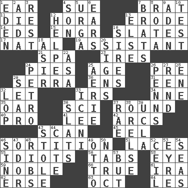 ACROSS 1. Hearing organ 4. Take to court 7. Naughty child 11. Expire 12. Israeli folk dance 13. Wear away 14. Begley and Asner 15. Engineer (abbr.) 16. Chalkboards 17. Brizilian seaport 19. Helper 21. Health resort 23. Angers 24. Sliced desserts 25. Personal question 26. Before (prefix) 29. Father Junipero _ 30. Followers of ems 31. Car or cant ending 32. Allow 33. Big collection agency 34. Compass dir. 35. Boat paddle 36. _-fi 37. Having a circular shape 40. Adept person 41. Area sheltered from the wind 42. Arches 43. Glance over 45. Snakelike fish 46. Casting lots 51. Shoestrings 55. Foolish or stupid persons 56. Bar bills 58. Sight organ 59. Impressive in appearance 60. Loyal 61. Lyricist Gershwin 62. Celtic language 63. Sep. follower 64. French article DOWN 1. Genesis locale 2. Opera by Verdi 3. State of inaction 4. Male offspring 5. Capital and largest city of Mongolia 6. Hearing organs 7. Naughty children 8. Round or rotation of duties 9. An important port of Yemen 10. Trial 12. Aide 13. Otherwise 16. Titles for men of rank and authority 18. SW Saudi Arabia district 20. Omens 22. White ___ sheet 24. Stone: prefix 25. Nest on high 26. Actor Sean's family 27. Tear apart 28. Compass dir. 29. Singe 32. Trim (branches) 33. Ancient Celtic tribe of eastern Britain 36. Narrow boards 37. Actress Charlotte 38. Threatening words 39. Southern CA. univ. 43. Fur scarf 44. Quote 46. Trig term 47. Scent 48. Teases 49. Von Bismarck 50. Drug cop 52. To provide with a ceiling 53. Jane of fiction 54. Oceans 57. On the contrary