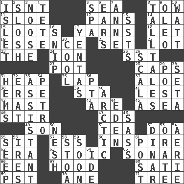 ACROSS 1. Is not 5. Ocean 8. Pull behind 11. A type of plum 12. Zero-star reviews 14. In the manner of 15. Plunders 17. Tall tales 18. Allow 19. Substance 21. Arrange properly for use 22. Car dealer's back yard 23. Definite Article 24. Electrically charged atom 25. Fast jet (abbr.) 27. Plant holder 28. Balmoral and tarboosh 31. Pile 35. Pet locale 37. _ vera 38. Celtic language 39. R.R. building 41. For fear that 42. Vertical spar for supporting sails 43. "We ___ not amused" (Victoria) 45. Toward the sea 46. Agitate 47. Music discs 49. Manchild 51. Beverage made from leaves 52. ___ good deed 55. Be seated 57. Double-curved letter 60. Motivate 62. Period 63. Unemotional 65. Echolocation 66. Car or cant ending 67. Parka part 68. Suttee (variant) 69. Pacific Standard Time (abbr.) 70. One (Scot) 71. Family _ (genealogy) DOWN 1. Small island 2. Make a splashing sound 3. Trap for birds or small mammals 4. Wig 5. Health resort 6. Hearing organs 7. Queen of England 1702-14 8. Baron Munchausen's specialties 9. Butter sub 10. Electrical Unit 13. Fast planes 16. Clip 17. Gossips 20. Calm and collected 26. Any of the three canals of the cochlea 29. Airs 30. Bristle 31. Equivocates 32. Part of Q.E.F. 33. Aide 34. Stone: prefix 36. Parent Teacher Assoc. 40. Northern region 44. Locale of original sin 48. Backtalk 50. Delicate 52. Middle Eastern gold or silver currency 53. Declaim 54. Nest on high 55. Ooze 56. Angers 58. Portico 59. Within a short period 61. Mail 64. Binary compound