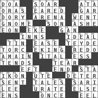 ACROSS 1. ___ good deed 4. Fly high 8. "One Day ___ Time" 11. Mouths or openings 13. Having ears or earlike features 15. Slender fish 16. Small, narrow, flatbottom fishing boat 17. Sports stadium 18. Left 19. Dwarf 21. Male child 22. American tennis player Robert 23. A really long time 24. Supplement with great effort 27. Separate the seeds from cotton 29. Taverns 30. Perfect 34. Shallow baking pan 36. Comfort 39. Miss Universe 1986, Barbara Palacios _ 40. Torque (variant) 41. Supplementing with great effort 43. Do over again 44. At full speed 46. Slanted text style (abbr.) 47. Double-curved letter 48. Is inclined (to) 49. Pull into pieces 51. Bank Draft (abbr.) 53. Conclusion 54. R.R. building 57. Image 60. Shoshoni 63. Prevent from occurring 65. Emitted 66. Lies 69. Indian skirt 70. Area sheltered from the wind 71. A salt of uric acid 72. Otherwise 73. Followers of ems 74. Single time 75. Snakelike fish DOWN 1. Evade 2. U. of Maine site 3. Composer Copland 4. Ocean 5. Boat paddle 6. Ancient Greek god of war 7. Western Nevada city 8. Matures 9. Hyperbolic tangent 10. Johnson of "Laugh-In" 12. Symbol (abbr.) 14. Mild oath, euphamism for damn 18. Nomad 20. Car or cant ending 25. Leg joint 26. 1973 Nobel Price Winner (Physics) Leo 28. Small island 29. Event 31. Snake ____ (dice throw) 32. Sums up 33. Lion 34. Heavy book 35. SW Asia republic 37. Be seated 38. Related on the mother's side 40. Make lace 42. Small, secluded valley 45. Overdraft (abbr.) 50. Find the sum of 52. Ballerina skirt 54. Having lost freshness 55. Laconic 56. Satellite of Uranus 57. Capri or Wight 58. Peachy ____! 59. Singles 61. Pacific island yam 62. Style 64. Compass dir. 67. And so on (abbr.) 68. Observe