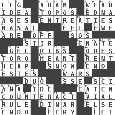 ACROSS 1. Part of a journey 4. First man 8. Put on (as clothing) 12. The main thing one is thinking about 14. Traditional theme or motif 16. Pulitzer Prize-winning author Ferber 17. Eons 18. Pleas 20. Rhinal 22. Snakelike fish 23. She-sheep 24. "We ___ not amused" (Victoria) 25. Not in operation 28. Distress signal 30. Use a swizzle stick 31. Maternal 35. Set 37. Teases 40. Lyric poems 41. "Corrida" creature 42. Intended 44. Monthly bill 45. Pile 46. Overwhelm 47. Conclude 48. _____ Park, CO 50. Armed conflicts 52. Superhero pair 54. Compass dir. 55. _-fi 58. Santa ___, CA 61. Binary compound 63. Consumed 65. Neutralize 70. Small bottle 71. General guideline 72. Middle Eastern gold or silver currency 73. Otherwise 74. Inside; within (prefix) 75. Suggestive of the supernatural 76. Allow DOWN 1. Woody, climbing, usually tropical plant 2. _ Allan Poe 3. Honkers 4. Had dinner 5. Spanish title 6. Fitting 7. Greater amount 8. Dripping 9. Singer Brickell 10. Afresh 11. Raze (variant) 13. White ___ sheet 15. Observes 19. _ vera 21. Car dealer's back yard 26. Not soft or yielding to pressure 27. Strips of potato fried in deep fat 29. Sounds asleep 30. Had an oblique or slanted direction 32. Arabian gulf 33. Be inclined (to) 34. Eastern Standard Time (abbr.) 35. Travels 36. Part of Q.E.F. 38. Forbid 39. Frozen precipitation (plural) 41. Definite Article 43. It was, poetically 49. Set or collection 51. To separate or throw off 53. Wrote a lyric poem 55. Not moving 56. Desist 57. An arm off of a larger body of water 58. 43,560 square feet 59. Part of speech 60. Old (Scot.) 62. One of the Great Lakes 64. "___ Maria" 66. Modern: prefix 67. One (Scot) 68. Automobile 69. Attempt to accomplish something