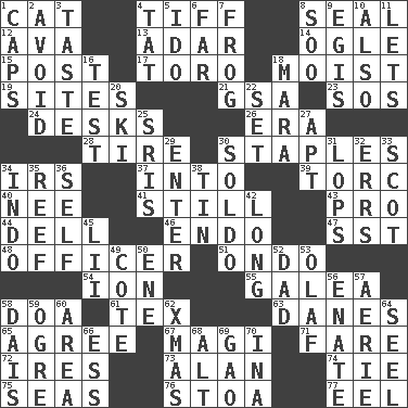 ACROSS 1. Domesticated feline 4. Small quarrel 8. Lick closed 12. Actress Gardner 13. The sixth month of the Jewish calendar 14. Stare 15. Mail 17. "Corrida" creature 18. Wet 19. Locates 21. Girls' org. (abbr.) 23. Distress signal 24. Writing tables 26. Epoch 28. Become fatigued 30. Paper fasteners 34. Big collection agency 37. To the inside or interior of 39. Torque (variant) 40. Born 41. Free of sound 43. Adept person 44. Small valley 46. Inside; within (prefix) 47. Fast jet (abbr.) 48. Person of authority 51. Southwest Nigerian state 54. Electrically charged atom 55. An organ shaped like a helmet 58. ___ good deed 61. John Ritter's dad 63. Natives or inhabitants of Denmark 65. Match 67. Wise men 71. Conductor's collection 72. Angers 73. ____ Jay Lerner 74. Standoff 75. Oceans 76. Portico 77. Snakelike fish DOWN 1. Balmoral and tarboosh 2. Shun 3. Clothes sense 4. Make lace 5. Wedding promise 6. Distant 7. Tree-dwelling hopper 8. "Barney Miller" actor Jack 9. Armor plate that protects the chest 10. In addition 11. Allows 16. Trial 18. Hindu Mythology: god of death 20. What Jean-Claude Killy likes to do 22. Put into a specified state 25. Indian titles of respect 27. Fitting 29. Keyboard key 30. Twentieth part of a lira 31. Chops off 32. Blunders 33. Native of Scotland 34. Southeast Asian peninsula 35. Coral collection 36. Itself 38. Shallow baking pan 42. Yearn 45. Cards in a Roman deck? 49. ____ d'Azur (French Riviera) 50. Compass dir. 52. Male parent 53. Norwegian king 56. Maternal 57. Nest on high 58. Raised platform 59. Legendary monster 60. Length times width 62. Dec. holiday 64. Sew up the eyelids of hawks and falcons 66. Double-curved letter 68. The first octave above the treble staff 69. E Mali city 70. _ tizzy (2 wds.)