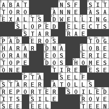 ACROSS 1. Blind as ____ 5. Overdraft (abbr.) 8. Be seated 11. "Corrida" creature 12. Singer Murray 13. White ___ sheet 14. Glorifies 17. Home 19. Had an oblique or slanted direction 21. Chooses 22. Play the lead 23. Actress Charlotte 24. Groovy apt. 27. Greek god of love 29. Coat; cloak 32. Ethiopian city, capital of Harari 34. Heredity factor (abbr.) 36. Ear part 37. NW Algerian seaport 38. Greek goddess of the dawn 39. 4th largest of the Great Lakes 40. Drink excessively 41. Two (Sp.) 42. Dwellings 43. Single 44. Become fatigued 46. Compass dir. 47. Parent Teacher Assoc. 50. Automatic 52. A viewer who gazes fixedly 55. Ringlike coral islands and reefs 57. Newsperson 59. Dirtied 62. ___ a Wonderful Life 63. Filth; sediment 64. Be footloose 65. Perceive with the eye 66. Snakelike fish 67. Adolescent DOWN 1. Had dinner 2. Gift holder 3. Ancient river in northeast Turkey 4. For Whom the Bell _____ 5. Compass dir. 6. Scornful expression 7. Chap (slang) 8. Ketch in the Levant 9. Is not 10. Labels 12. Say or write further 15. Carrier 16. Practice fight 18. Area sheltered from the wind 20. Eaten away 24. Picture 25. Composer Copland 26. Window treatment 28. Snout, nose 29. Singer Mel 30. Off-Broadway awards 31. Honkers 33. One (Scot) 35. Help 36. Lion 42. Phone greeting 45. Vintage cars 47. Adept person 48. Laconic 49. Nick name for Arthur 51. Seductive woman who exploits men 52. Indian titles of respect 53. Wig 54. Domed church section 55. "We ___ not amused" (Victoria) 56. A type of plum 58. Pipe bend 60. First lady 61. Lair