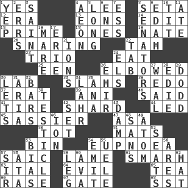 ACROSS 1. It is so 4. Toward shelter 8. Bristle 12. Period 13. Immeasurably long periods of time 14. Prepare for publication 15. First class 18. Washington bills 19. Nathan's nickname 20. Catching in a trap 22. Scottish cap 23. Musical group of three 24. Erode 25. Car or cant ending 26. Shoved, as through a crowd 30. Experiment locale 33. Shuts with force 36. Make new 37. Part of Q.E.F. 39. Cuckoo 40. Expressed in words 41. Become fatigued 42. Broken piece 44. Directed 45. More impudent 47. White ___ sheet 50. Small child 51. Floor protectors 53. Storage container 54. Normal relaxed breathing 57. Ketch in the Levant 59. Unable to walk 61. Excessive but superficial compliments 63. Slanted text style (abbr.) 64. Morally bad or wrong 65. Afternoon social gathering 66. To erase 67. Yard entry 68. Fast jet (abbr.) DOWN 1. Slangy assent 2. Blunders 3. Inhabitant of Heaven 4. Age 5. Yearn 6. Compass dir. 7. Curvy letter 8. Legislators 9. Dutch treat 10. Teat (slang) 11. Had dinner 16. Female horse 17. One of the Great Lakes 21. Charged atoms 22. Bar bill 24. Raised railways 26. Independent ruler or chieftain 27. Welt 28. Singer Brickell 29. Texas town _ City 30. Allows 31. Operatic vocal solo 32. Oblong pieces of solid material 34. Cowardly lion portrayer 35. Santa ___, CA 38. One of the two male reproductive glands 42. Put into a specified state 43. Moist 46. Electrically charged atom 48. Without 49. Smallest unit of an element 52. Theater features 53. Prejudice 54. Give off 55. Ubangi River tributary 56. Ancient Greek god of war 57. Title for a knight 58. "One Day ___ Time" 59. Part of a journey 60. Actress Gardner 62. Floor protector