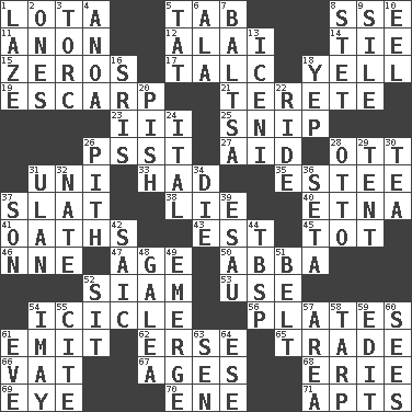 ACROSS 1. Globular water bottle used in Asia 5. Keyboard key 8. Compass dir. 11. Soon (poet.) 12. Mountain range southwest of Kyrgyzstan 14. Standoff 15. Nothings 17. Baby powder 18. Shout 19. Fortification 21. Cigar-shaped 23. One more than two 25. Clip 26. Inconspicuous attention getter 27. Assist 28. Baseball player Mel 31. University (slang) 33. Possessed 35. First name in cosmetics 37. Narrow board 38. Falsehood 40. Inactive volcano in Sicily 41. Profane or obscene expressions 43. Eastern Standard Time (abbr.) 45. Small child 46. Compass dir. 47. Mature 50. Swedish rock group 52. Thailand, formerly 53. Purpose 54. Ice on the eave 56. Food holders 61. Give off 62. Celtic language 65. Exchange 66. Large container 67. Ripens 68. 4th largest of the Great Lakes 69. Sight organ 70. Compass dir. 71. Flats, for short DOWN 1. Goldbrick 2. Singles 3. Torque (variant) 4. Small Philippine buffalo 5. Make lace 6. In the manner of 7. Greek mezzo-soprano Agnes 8. Proofreading order 9. Drop; flow; fall 10. Snakelike fish 13. Ancient Celtic tribe of eastern Britain 16. Indian titles of respect 18. Slangy assent 20. Expression of disdain 22. Travel on an animal 24. Slanted text style (abbr.) 26. Essential or central part 28. Von Bismarck 29. Portable shelter 30. Beverage made from leaves 31. ____ Bator, Mongolia 32. Nathan's nickname 34. Expire 36. Stalk of a moss capsule 37. Male child 39. Son of Isaac 42. Ketch in the Levant 44. Cook's measure (abbr.) 48. An organ shaped like a helmet 49. Develop 51. Waist strap 52. Be seated 54. "If ____ say so..." 55. Quote 57. Length times width 58. Canvas cover 59. Prepare for publication 60. Observes 61. Night before a holiday 63. Elected rep. 64. Compass dir.